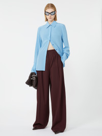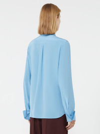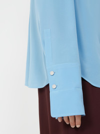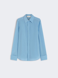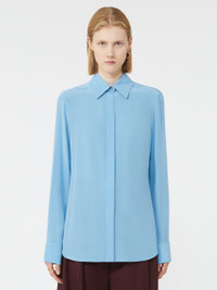 DETAILS Pure silk shirt with timeless elegance, reinterpreted in the classic Sportmax aesthetic. The custom metal buttons and wide cuff add character to the design. Pure silk crepe de Chine shirt Feminine fit Shirt collar Concealed front closure with visible top button Customised metal buttons on the collar and cuffs Wide foldable cuff with double button Regular fit COMPOSITION AND CARE 100% silk. Hand wash cold (40°c max); do not bleach; do not tumble dry; line drying in the shade; cool iron; professionally dry clean perchloroethylene - mild process; do not wet clean.; remove the collar stays before washing. Distributed by Max Mara S.r.l., registered office in Reggio Emilia (Italy), Via Giulia Maramotti 4, 42124 (IT)