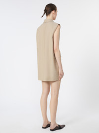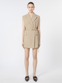 DETAILS Long blazer with tailored construction, with large peak lapels and sleeveless line. The construction features an overlapping panel on the back, with an opening along the sides and a double-wrap belt that cinches the silhouette only at the front. Can also be worn as a mini dress. Long blazer in pure yarn-dyed wool canvas with lining Regular fit Collar with peak lapels Sleeveless model, with side flap pockets Low double-wrap fabric belt, with S-shaped metal buckle Regular fit COMPOSITION AND CARE Fabric 100% virgin wool; lining 50% acetate, 50% viscose. Do not wash; do not bleach; do not tumble dry; cool iron; professionally dry clean perchloroethylene - mild process; do not wet clean.; do not iron the buttons.; remove the buckle before washing. Distributed by Max Mara S.r.l., registered office in Reggio Emilia (Italy), Via Giulia Maramotti 4, 42124 (IT)