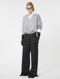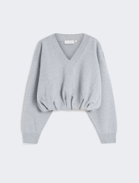 Brushed sweatshirt with wide V-neck, dropped shoulders and ribbed details. The garment hem features a special gathered construction. - Cotton blend stretch sweatshirt - Oversized fit with cropped length at the waist - V neck - Printed logo on the left shoulder - Hem with gathered effect - Ribbed knit cuffs and neckline - Lined in stretch tulle - Wide fit Composition and Care Jersey fabric 87% cotton, 13% elastomultiester; lining 94% polyamide, 6% elastane. Machine wash cold delicate cycle; do not bleach; do not tumble dry; flat drying in the shade; cool iron; do not dry clean; professional wet cleaning - very mild process.; iron with a cloth between.; using neutral detergent.; turn the articles inside out before washing.; to be ironed on reverse. Distributed by Max Mara S.r.l., registered office in Reggio Emilia (Italy), Via Giulia Maramotti 4, 42124
