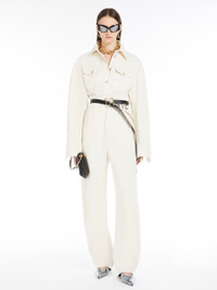 DETAILS Wide trousers in garment-washed ecru bull, with an original high-waisted constructionand dropped crotch. The carrot-shaped legs narrow at the ankle, creating a rounded shape. The garment is completed by contrasting stitching and a matching belt with an S-shaped metal buckle and back patch pockets. COMPOSITION AND CARE 100% cotton. Machine wash cold delicate cycle; do not bleach; do not tumble dry; line drying in the shade; cool iron; professionally dry clean perchloroethylene - mild process.; remove the buckle before washing. Distributed by Max Mara S.r.l., registered office in Reggio Emilia (Italy), Via Giulia Maramotti 4, 42124 (IT)