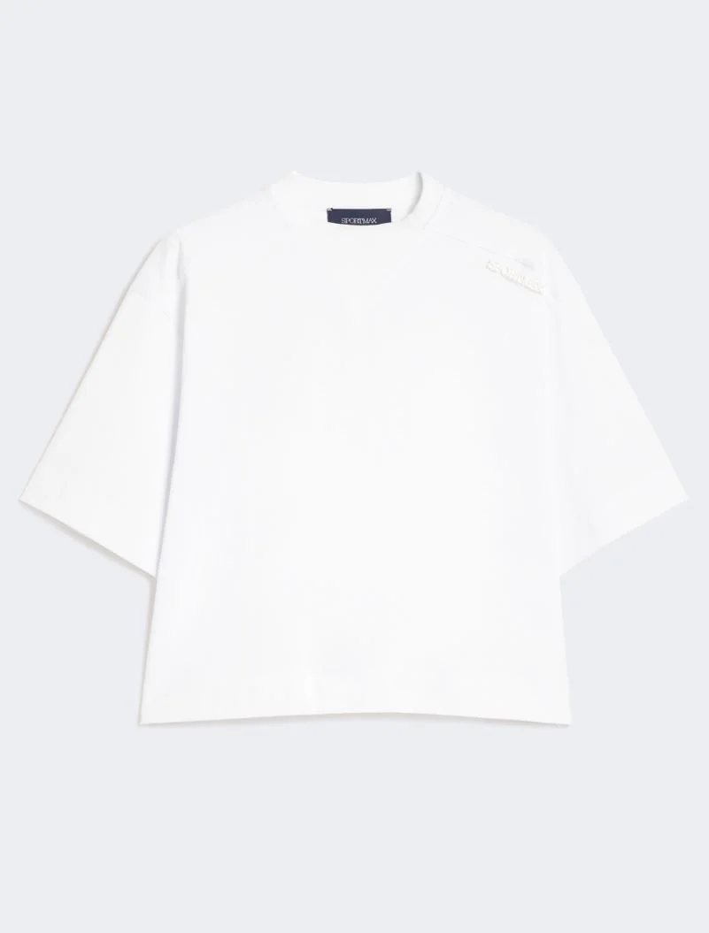 A contemporary evolution of the boxy t-shirt, designed with an original crater neck emphasised by the ribbed insert. The fit is straight over the torso with small on-tone logo printed on the left shoulder. - Pure cotton T-shirt - Boxy cut - Crater neck with rib-knit insert - Front yoke - Stitching motif along the edges - Regular fit Composition and Care 100% cotton. Hand wash cold (40°c max); do not bleach; do not tumble dry; flat drying in the shade; cool iron; do not dry clean; do not wet clean.; iron with a cloth between.; using neutral detergent.; don’t rub.; turn the articles inside out before washing.; to be ironed on reverse. Distributed by Max Mara S.r.l., registered office in Reggio Emilia (Italy), Via Giulia Maramotti 4, 42124