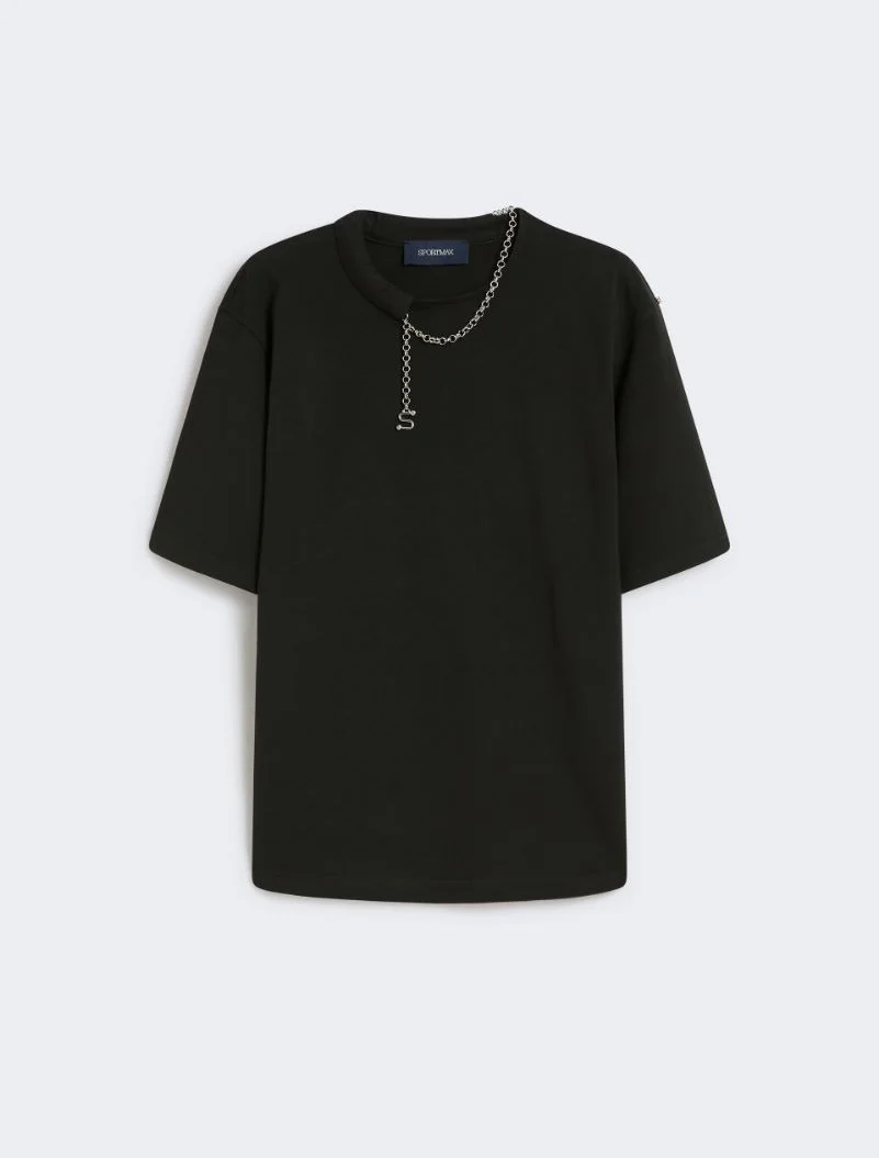T-shirt with an original construction, and a special neckline that allows for the insertion of a necklace with a personalized pendant. - Pure cotton jersey T-shirt - Straight fit. - Rounded neckline with original construction - Ribbed details along the edges - Fit Composition and Care Jersey fabric 100% cotton; - exclusive of accessories. Machine wash cold delicate cycle; do not bleach; do not tumble dry; flat drying in the shade; cool iron; professionally dry clean perchloroethylene - mild process; professional wet cleaning - very mild process.; iron with a cloth between.; using neutral detergent.; before cleaning the style remove the accessories. Distributed by Max Mara S.r.l., registered office in Reggio Emilia (Italy), Via Giulia Maramotti 4, 42124