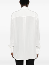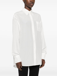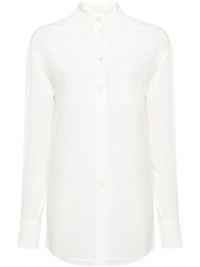 crepe de chine silk shirt Highlights - White - Silk - Crepe de chine - Pointed flat collar - Drop shoulder - Long sleeves with buttoned cuffs - Crystal detail at the cuff - Chest patch pocket - Inverted pleat to the rear - Curved hem - Front button fastening Made in Italy Composition Silk 100% SIZE & FIT Model measurements Height 5 ft 11 in(1.8 m) Bust/Chest 32.67 in(83 cm) Hips 36.22 in(92 cm) Waist 24.4 in(62 cm) FittingInformation Designed to be unstructured, offering a loose fit throughout Made from a lightweight non-stretch fabric This piece fits true to size – take your usual size Washing instructions Dry Clean Only
