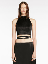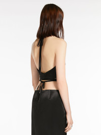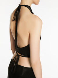 DETAILS Sleeveless top in crinkle-look washed acetate satin fabric. The back-tying halterneck provides for a fully backless design. The garment crosses over the back and fastens by means of a multi-wrap ribbon at the waist COMPOSITION AND CARE Fabric 100% acetate; lining 95% acetate, 5% elastane. Do not wash; do not bleach; do not tumble dry; cool iron; professionally dry clean perchloroethylene - mild process; do not wet clean.; put this item into a string bag before washing it.; don’t iron the labels.; when ironing, take care not to flatten the wavy look of the fabric. Distributed by Max Mara S.r.l., registered office in Reggio Emilia (Italy), Via Giulia Maramotti 4, 42124 (IT)