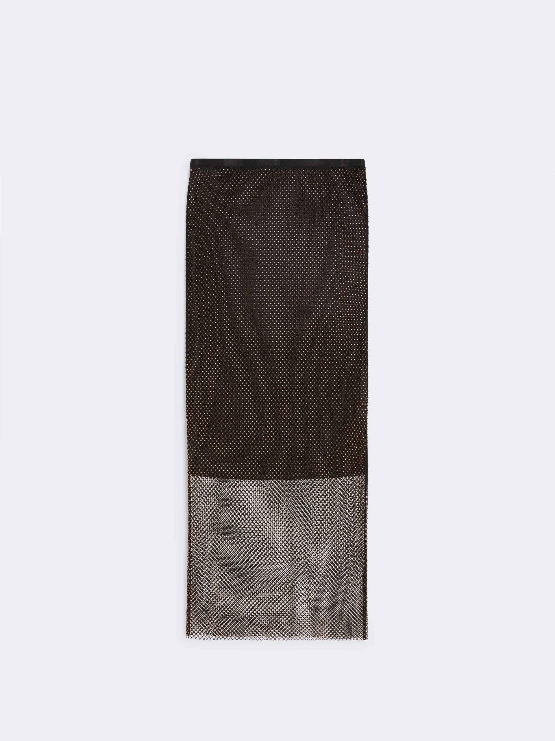 DETAILS Midi skirt with clean lines made of mesh with applied rhinestones. Minimalist in shape, it is completed with on tone lining. Midi skirt in mesh with applied rhinestones Straight fit. Elasticated insert at the waist Garment lined with viscose jersey Fit COMPOSITION AND CARE Jersey skirt jersey fabric 97% polyester, 3% elastane; - exclusive of decoration. Petticoat 100% viscose. Jersey skirt: hand wash cold (40°c max); do not bleach; do not tumble dry; flat drying in the shade; do not iron; do not dry clean; do not wet clean.; Using neutral detergent.; Don’t rub. Petticoat: do not wash; do not bleach; do not tumble dry; cool iron; professionally dry clean perchloroethylene - mild process; do not wet clean.; Iron with a cloth between. Distributed by Max Mara S.r.l., registered office in Reggio Emilia (Italy), Via Giulia Maramotti 4, 42124 (IT)