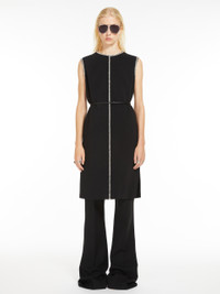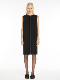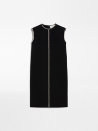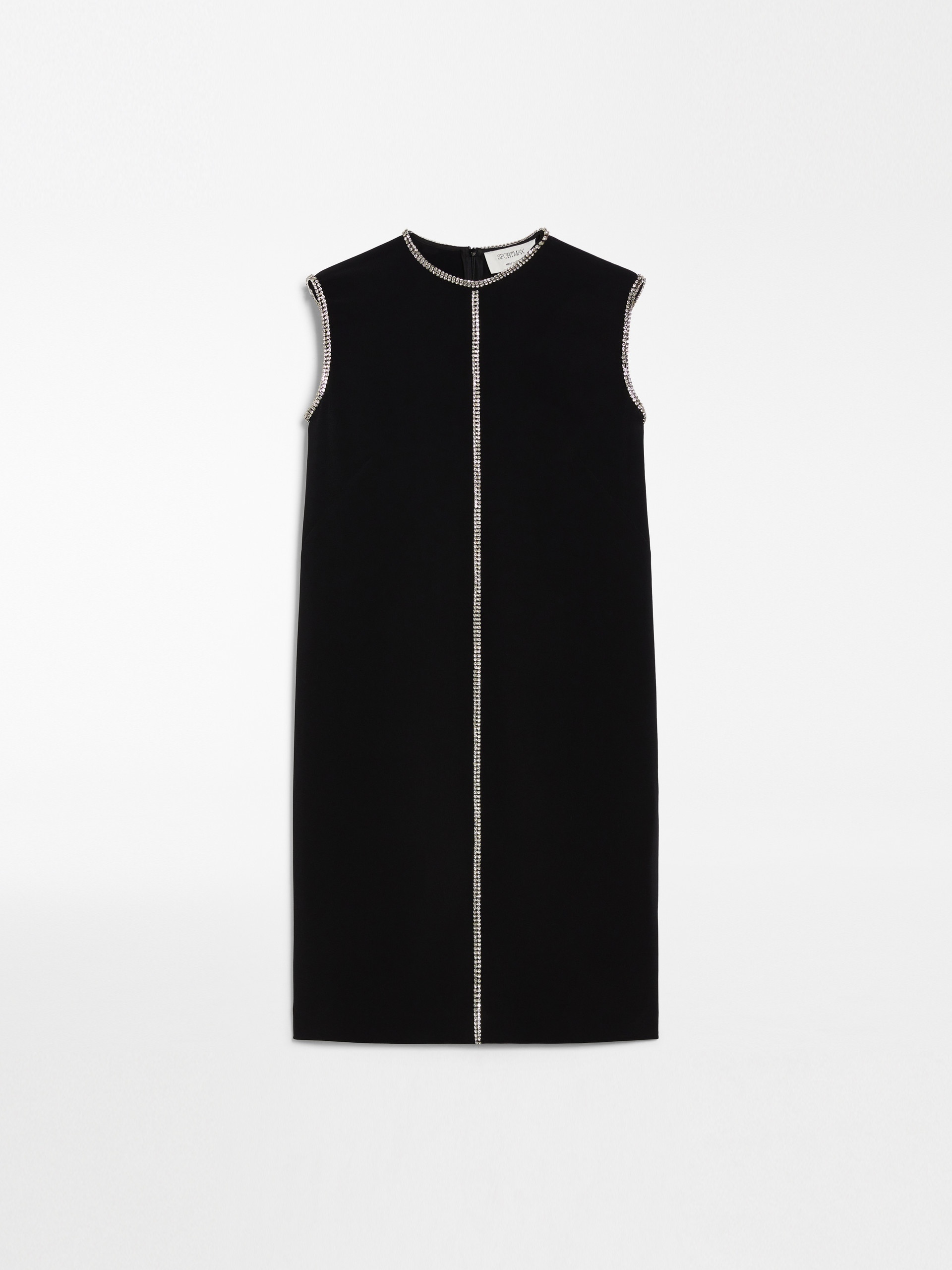 DETAILS Straight, sleeveless dress made of stretch viscose cady, decorated with a double row of rhinestones on the crew neckline, sleeve edge and central seam at the front. The garment is completed with diagonal darts on the bodice for a feminine fit and an overlapping slit on the left side. The concealed zip on the back makes it easy to put on. COMPOSITION AND CARE Fabric 97% viscose, 3% elastane; - exclusive of decoration. Do not wash; do not bleach; do not tumble dry; cool iron; professionally dry clean perchloroethylene - mild process; do not wet clean.; put this item into a string bag before washing it.; do not iron the decoration. Distributed by Max Mara S.r.l., registered office in Reggio Emilia (Italy), Via Giulia Maramotti 4, 42124 (IT)