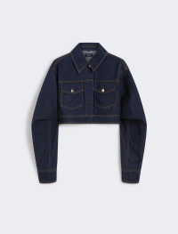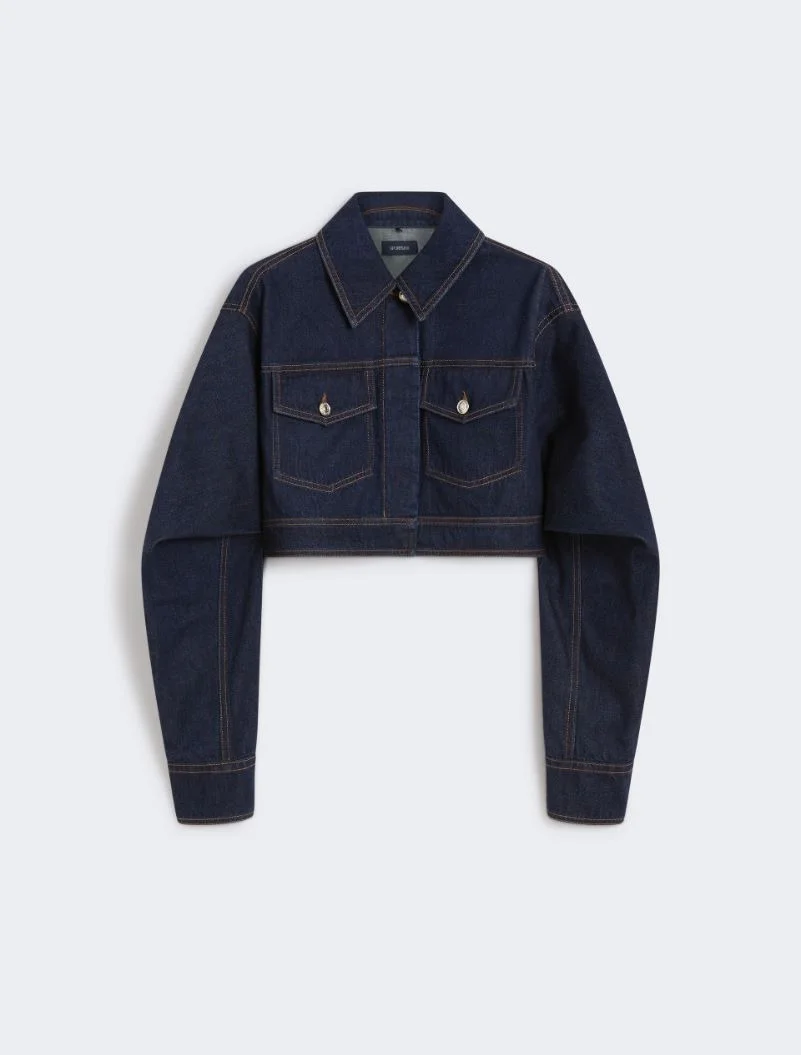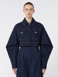 Boxy denim jacket with shaped cuts on the sleeves that create a play of stitching. Concealed button placket for a cleaner line. - Soft, dark clean indigo denim jacket, garment-treated for a dark, clean effect - Boxy fit, short at the waist - Shirt collar with covered button placket and custom tack buttons - Pockets with shaped flap positioned on the chest - Shapes and cuts emphasized by tobacco thread stitching - Regular fit Composition and Care 100% cotton. Machine wash cold delicate cycle; do not bleach; do not tumble dry; line drying in the shade; cool iron; professionally dry clean perchloroethylene - mild process.; wash the garment while it is fastened.; do not iron the buttons.; remove the cufflinks before washing.; take care when wearing light-coloured clothes or accessories because, with the heat of the body, the indigo fabric , may fade and stain. be careful while sitting on light coloured surfaces, especially if wet. wash garments separately and always turned inside out. hang the garment turned inside out by avoiding to expose it to direct sunlight. avoid removing isolated stains. Distributed by Max Mara S.r.l., registered office in Reggio Emilia (Italy), Via Giulia Maramotti 4, 42124
