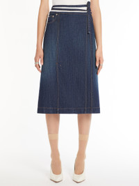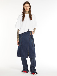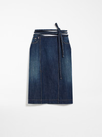 DETAILS Wrap skirt in vintage dark and mid wash indigo denim fabric. The model boasts a straight fit at the hips, in addition to overlapping slits and ties that fasten at the waist for a multi wrap effect. Iconic jeans model reminiscent rounded front pockets, patch rear pockets and contrasting topstitching. COMPOSITION AND CARE 100% cotton. Machine wash cold delicate cycle; do not bleach; do not tumble dry; line drying in the shade; cool iron; do not dry clean.; don’t iron the labels.; take care when wearing light-coloured clothes or accessories because, with the heat of the body, the indigo fabric , may fade and stain. be careful while sitting on light coloured surfaces, especially if wet. wash garments separately and always turned inside out. hang the garment turned inside out by avoiding to expose it to direct sunlight. avoid removing isolated stains. Distributed by Max Mara S.r.l., registered office in Reggio Emilia (Italy), Via Giulia Maramotti 4, 42124 (IT)