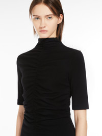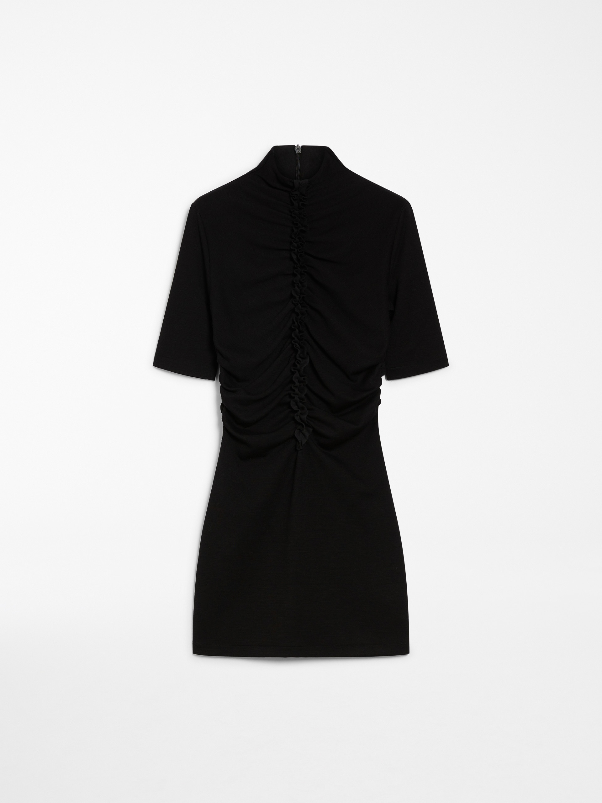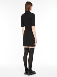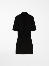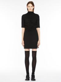 DETAILS Short wool-blend jersey dress featuring a high neck and above-elbow-length sleeves. The feminine, slim fit is accentuated by the bodice-cinching central front gathers. COMPOSITION AND CARE 48% wool, 45% cotton, 7% polyamide. Do not wash; do not bleach; do not tumble dry; cool iron; professionally dry clean perchloroethylene - mild process; do not wet clean.; iron with a cloth between. Distributed by Max Mara S.r.l., registered office in Reggio Emilia (Italy), Via Giulia Maramotti 4, 42124 (IT)