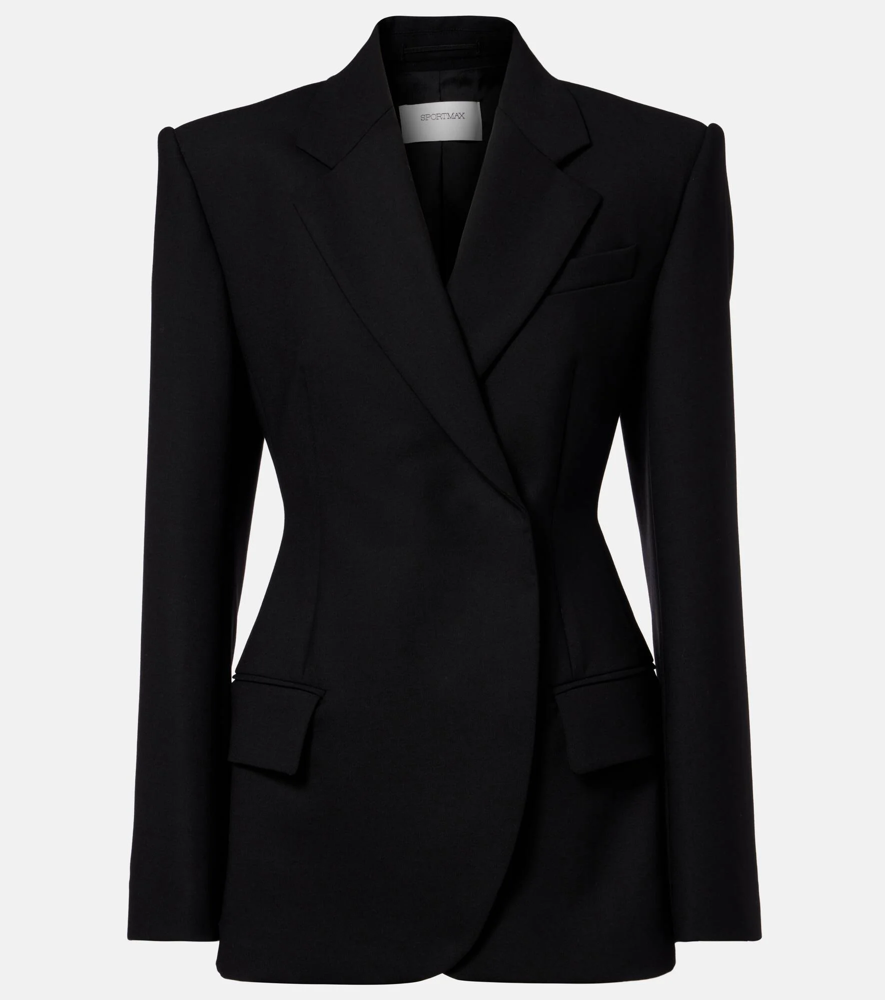 Founded on the principles of tailoring and experimentation, Sportmax combines a contemporary urban spirit with sportswear-inspired silhouettes. This blazer is crafted from a double-faced canvas and has a double-breasted silhouette with a peplum. Product Details - Material: 56% polyester, 40% wool, 4% elastane - Care instructions: dry clean - Made in Poland - Color: black - Designer color name: Nero - Item color: black - Lining: 70% acetate, 30% polyester - Sleeve lining: 97% viscose, 3% acetate - Notched lapel - Shoulder pads - Closure: concealed buttoned front - Pockets: breast pocket, flap pockets - Cuff: four buttons - Item number: P01124173 Size & Fit - True to size - Shoulder pad inserts - Cinched waist - Non-stretchy fabric - Falls below the hip - The model seen in the picture is 178cm-5'10" and wearing a size DE 34