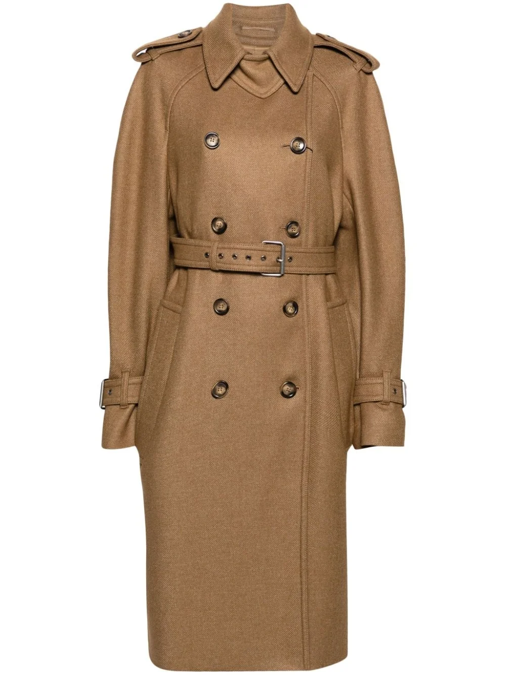 double-breasted twill trench coat Highlights - Camel brown - Twill weave - Spread collar - Front hook and eye fastening - Double-breasted button fastening - Epaulettes - Long raglan sleeves - Belted cuffs - Detachable waist belt - Belt loops - Two side slit pockets - Full lining - Locker loop - Straight hem - Above-knee length Made in Italy Composition Outer: Virgin Wool 49%, Lyocell 29%, Polyamide 22% Lining: Acetate 50%, Viscose 50%