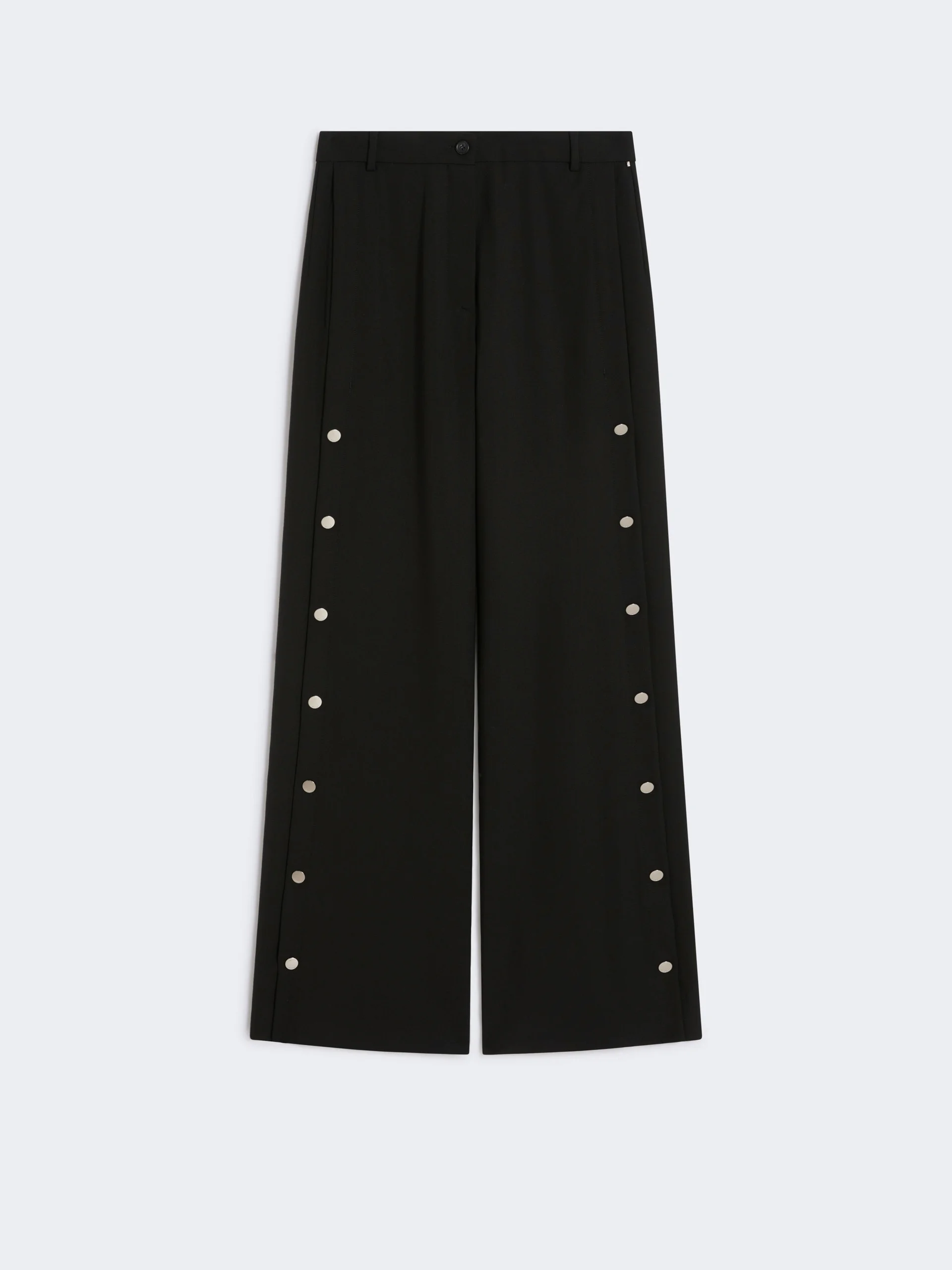 DETAILS Trousers in soft stretch wool, with side slits held in place by custom press studs. Opening adjustable as desired. Stretch wool trousers Regular fit with wide leg and slightly low waist Closure with visible horn-effect button and concealed zip High side slits with custom snap buttons Back welt pockets Regular fit COMPOSITION AND CARE 100% virgin wool. Do not wash; do not bleach; do not tumble dry; cool iron; professionally dry clean perchloroethylene - mild process; do not wet clean.; wash the garment while it is fastened.; turn the articles inside out before washing. Distributed by Max Mara S.r.l., registered office in Reggio Emilia (Italy), Via Giulia Maramotti 4, 42124 (IT)