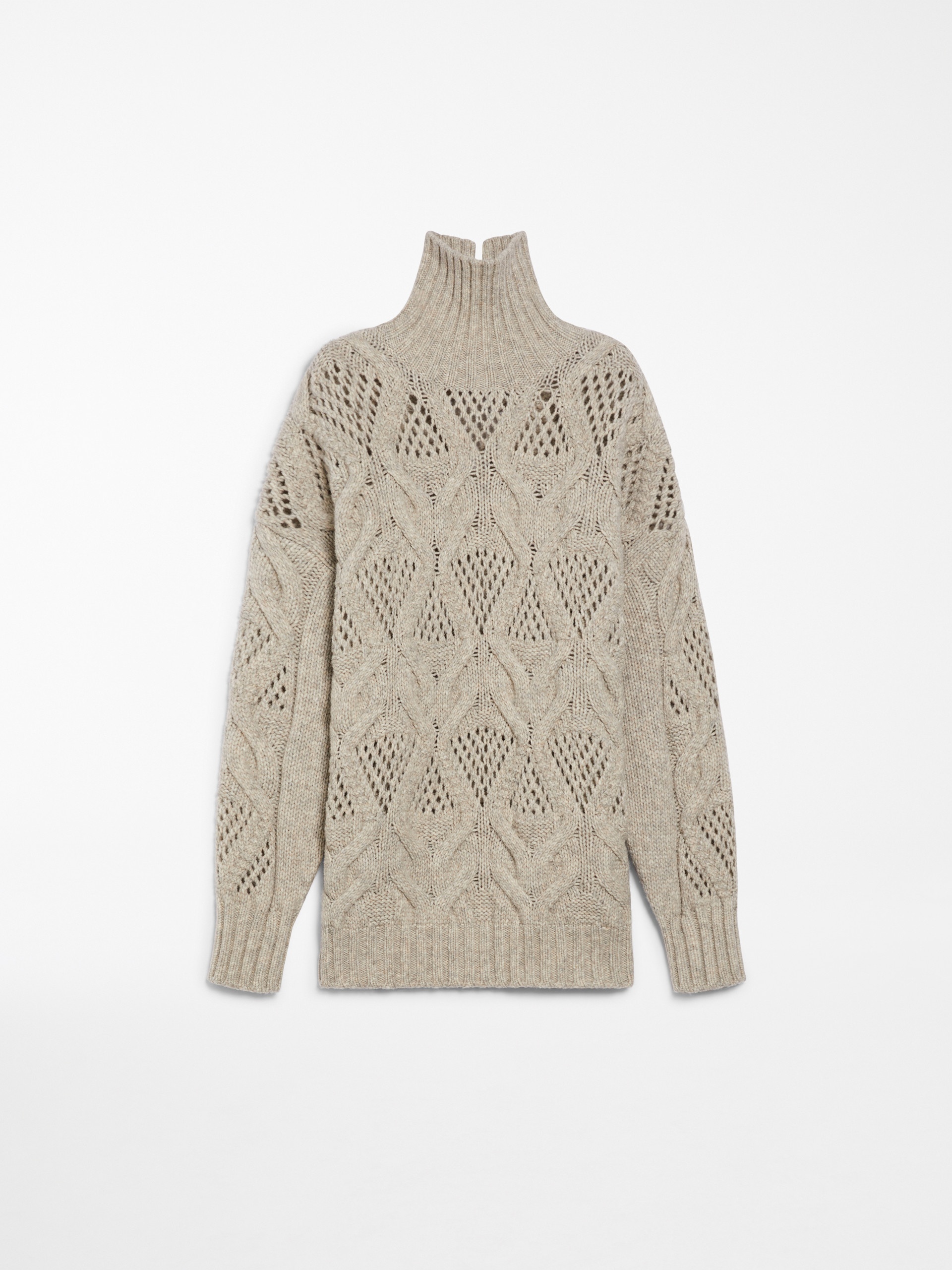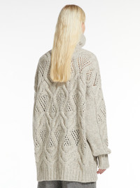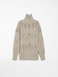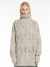 DETAILS Maxi sweater in fluffy-hand wool-blend yarn featuring a perforated diamond-knit pattern for an open-work effect. The oversized model boasts a rib-knit mock polo-neck, hem and cuffs. Below-hip length. COMPOSITION AND CARE 70% wool, 30% polyamide. Do not wash; do not bleach; do not tumble dry; cool iron; professionally dry clean perchloroethylene - mild process; do not wet clean.; iron with a cloth between. Distributed by Max Mara S.r.l., registered office in Reggio Emilia (Italy), Via Giulia Maramotti 4, 42124 (IT)