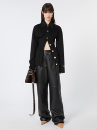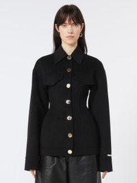 DETAILS Fitted pea coat made from double pure wool, with deep pleats and details inspired by denim models. Closure with large mirrored metal buttons with engraved logo. Double pure-wool drap pea coat. Fitted torso and loose sleeves Shirt collar Visible metal button fastening. Dropped shoulder with yoke both front and back Fitted COMPOSITION AND CARE Fabric 100% virgin wool; - except joining thread. Do not wash; do not bleach; do not tumble dry; cool iron; professionally dry clean perchloroethylene - mild process; do not wet clean. Distributed by Max Mara S.r.l., registered office in Reggio Emilia (Italy), Via Giulia Maramotti 4, 42124 (IT)