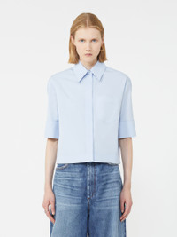 DETAILS Clean-lined boxy shirt with hidden button placket and chest pocket. The S-shaped cufflink on the wrist adds a personalized touch. Pure cotton poplin shirt. Boxy fit Shirt collar Hidden buttoning with chest pocket and back yoke with pleat Short sleeve with S-cuff and cufflink Regular fit COMPOSITION AND CARE 100% cotton. Machine wash cold delicate cycle; do not bleach; do not tumble dry; line drying in the shade; cool iron; professionally dry clean perchloroethylene - mild process.; remove the cufflinks before washing. Distributed by Max Mara S.r.l., registered office in Reggio Emilia (Italy), Via Giulia Maramotti 4, 42124 (IT)