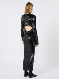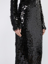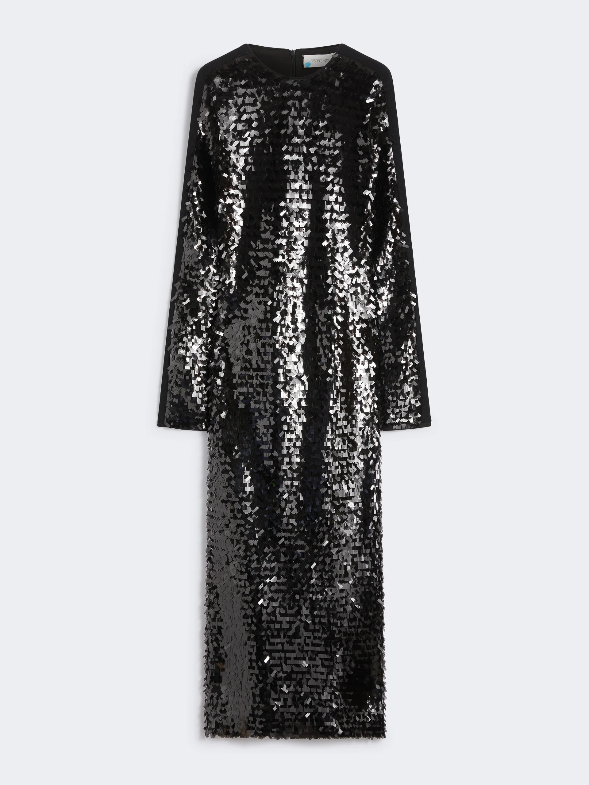 DETAILS Glamorous dress made of jersey with embroidered rectangular sequins. The back remains uncovered thanks to the keyhole opening above the hips. Jersey dress embroidered all over with rectangular sequins Fitted Rounded neckline Back opening with zip Ribbed knit inserts on shoulders, sleeves and sides Back with opening and drape Regular fit COMPOSITION AND CARE Jersey fabric 97% polyester, 3% elastane; joining thread 100% polyester; lining 95% polyester, 5% elastane; - exclusive of decoration. Hand wash cold (40°c max); do not bleach; do not tumble dry; flat drying in the shade; do not iron; do not dry clean; do not wet clean.; using neutral detergent.; don’t rub. Distributed by Max Mara S.r.l., registered office in Reggio Emilia (Italy), Via Giulia Maramotti 4, 42124 (IT)