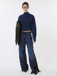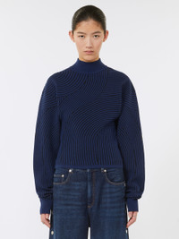 DETAILS Regular fit jumper with wide sleeves and high neck. The three-dimensional jacquard craftsmanship, featuring sinuous lines, adorns the entire design. Jumper made of a stretch wool-blend yarn Fitted High neck Wide sleeve 3D curved jacquard pattern Ribbed edges Regular fit COMPOSITION AND CARE 62% wool, 27% polyamide, 8% polyester, 3% elastane. Hand wash cold (40°c max); do not bleach; do not tumble dry; flat drying in the shade; cool iron; professionally dry clean perchloroethylene - mild process; do not wet clean.; iron with a cloth between.; using neutral detergent. Distributed by Max Mara S.r.l., registered office in Reggio Emilia (Italy), Via Giulia Maramotti 4, 42124 (IT)