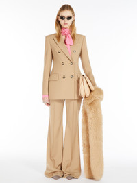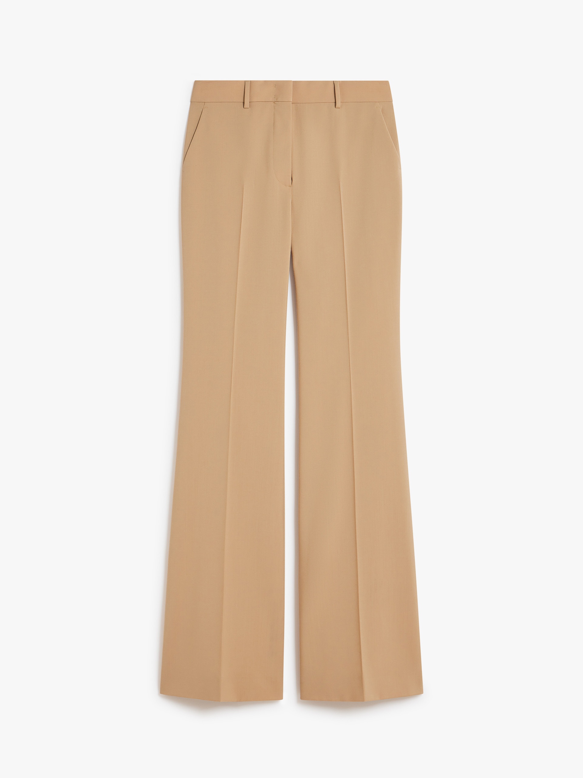 DETAILS Flared mid-rise trousers in natural stretch pure woollen cloth featuring pressed pleat detail on the front and back. The tailored model-inspired design boasts a concealed fastening, belt loop detail at the waist and a branded internal waistband. Slant side pockets and welt rear pockets. COMPOSITION AND CARE 100% virgin wool. Do not wash; do not bleach; do not tumble dry; cool iron; professionally dry clean perchloroethylene - mild process; do not wet clean. Distributed by Max Mara S.r.l., registered office in Reggio Emilia (Italy), Via Giulia Maramotti 4, 42124 (IT)