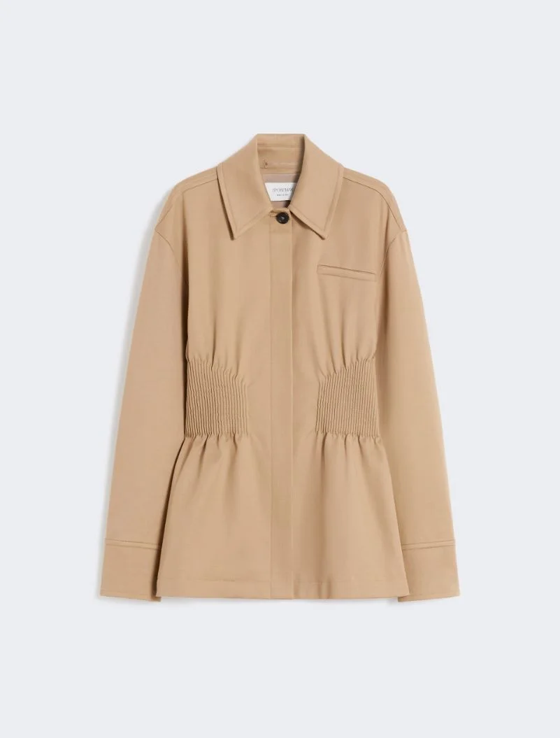 Shirt jacket with hourglass line and fitted waist. The silhouette is accentuated by the cannete motif that contours the back up to the buttoning. - Shirt jacket in pure stretch cotton double-face gabardine - Shirt collar with concealed buttoning - Cannete embroidery motif - Regular fit Composition and Care Fabric 97% cotton, 3% elastane; - exclusive of decorative yarns; lining 95% acetate, 5% elastane. Machine wash cold delicate cycle; do not bleach; do not tumble dry; line drying in the shade; cool iron; professionally dry clean perchloroethylene - mild process.; wash the garment while it is fastened.; turn the articles inside out before washing. Distributed by Max Mara S.r.l., registered office in Reggio Emilia (Italy), Via Giulia Maramotti 4, 42124