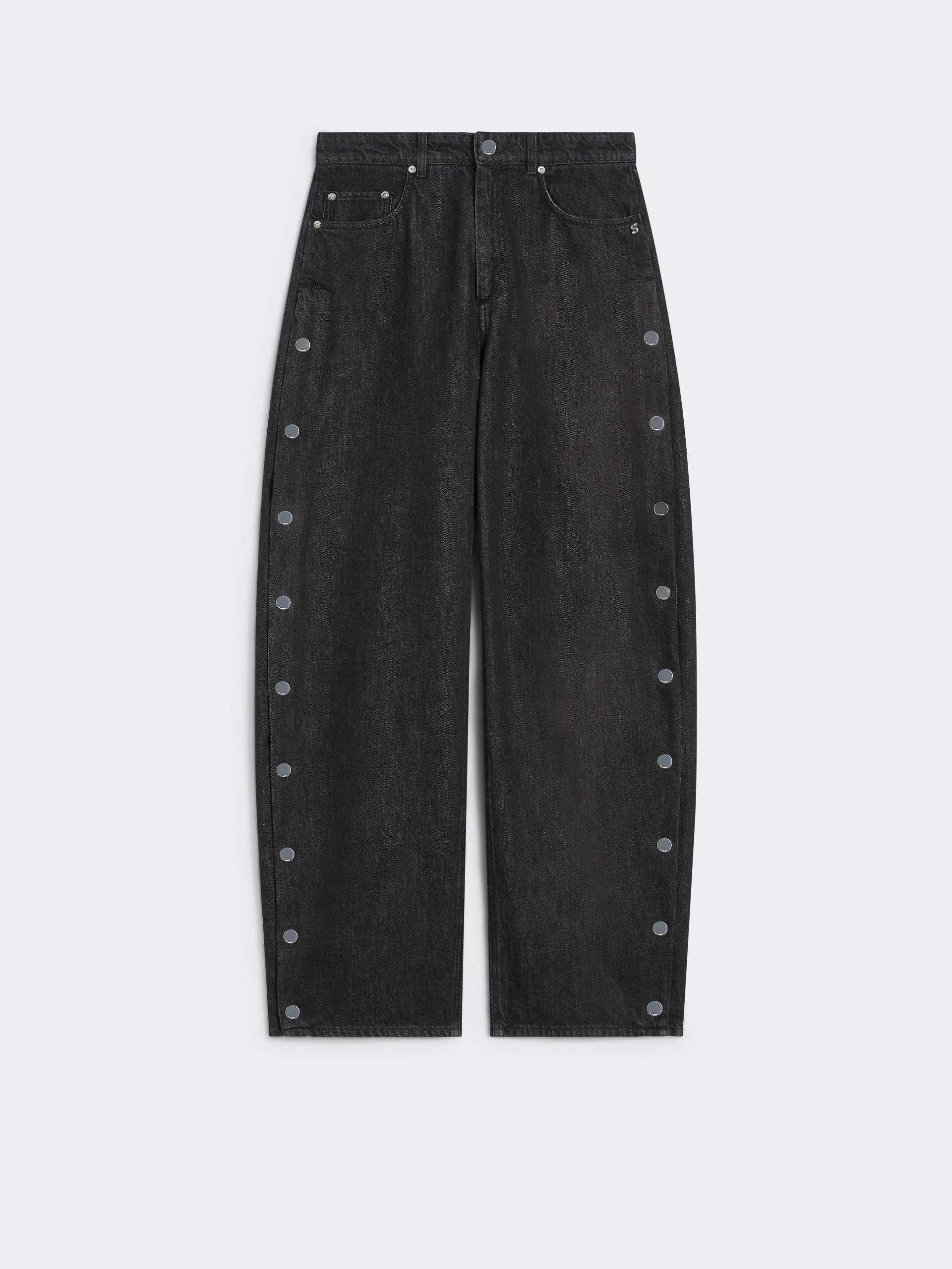 DETAILS Jeans in soft and lightweight black denim, with wide leg, low waist and crotch. The garment features a set of snap buttons along the sides. Lightweight and soft black denim jeans with dark clean treatment Wide leg fit with low waist and crotch Closure with custom metal button and S-rivet on the right pocket Matching tone stitching Custom snap button motif along the sides Back pockets with pen holder stitching Wide fit COMPOSITION AND CARE 100% cotton. Machine wash cold delicate cycle; do not bleach; do not tumble dry; line drying in the shade; cool iron; do not dry clean.; wash the garment while it is fastened.; do not iron the buttons.; take care when wearing light-coloured clothes or accessories because, with the heat of the body, the denim fabric that comes into contact with them may bleed and stain. be careful while sitting on pale colored surfaces, especially if wet. wash denim items separately and always turned inside out. hang the garment turned inside out by avoiding to expose it to direct sunlight. avoid removing isolated stains.; contains non-textile parts of animal origin. Distributed by Max Mara S.r.l., registered office in Reggio Emilia (Italy), Via Giulia Maramotti 4, 42124 (IT)