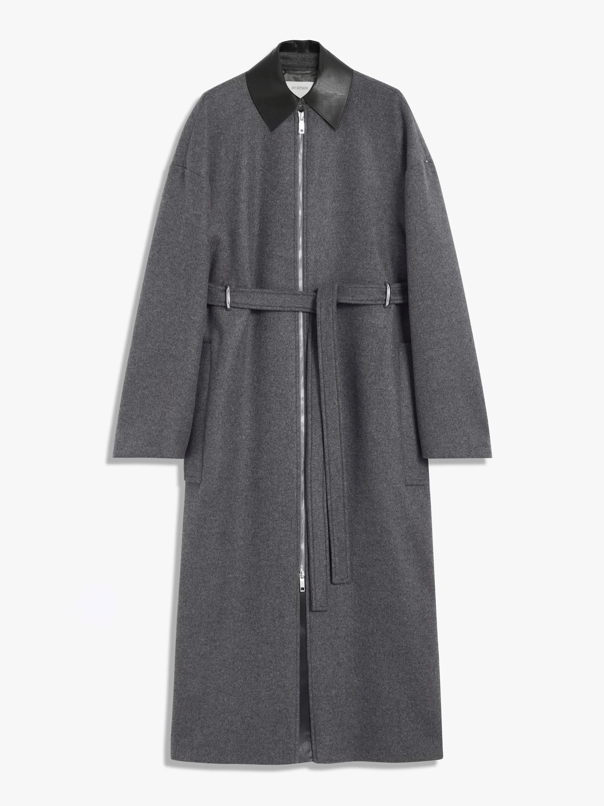 DETAILS Double-sided pure wool coat, with single-breasted construction and metal zip on the front that adds a dynamic note. The belt accentuates the waist and shapes the silhouette. Double pure virgin wool coat with coated fabric collar Straight fit Visible metal zip closure and belt with metal loops Inset side pockets Internal coated fabric insert, side pockets with flap Lined garment with centre-back slit Oversize fit COMPOSITION AND CARE Fabric 100% virgin wool; - except joining thread, exclusive of coating; fabric 2 100% polyester; coating polyurethane; lining 50% acetate, 50% viscose. Do not wash; do not bleach; do not tumble dry; cool iron; professionally dry clean perchloroethylene - mild process; do not wet clean.; remove metal parts before washing.; iron with a cloth between. Distributed by Max Mara S.r.l., registered office in Reggio Emilia (Italy), Via Giulia Maramotti 4, 42124 (IT)