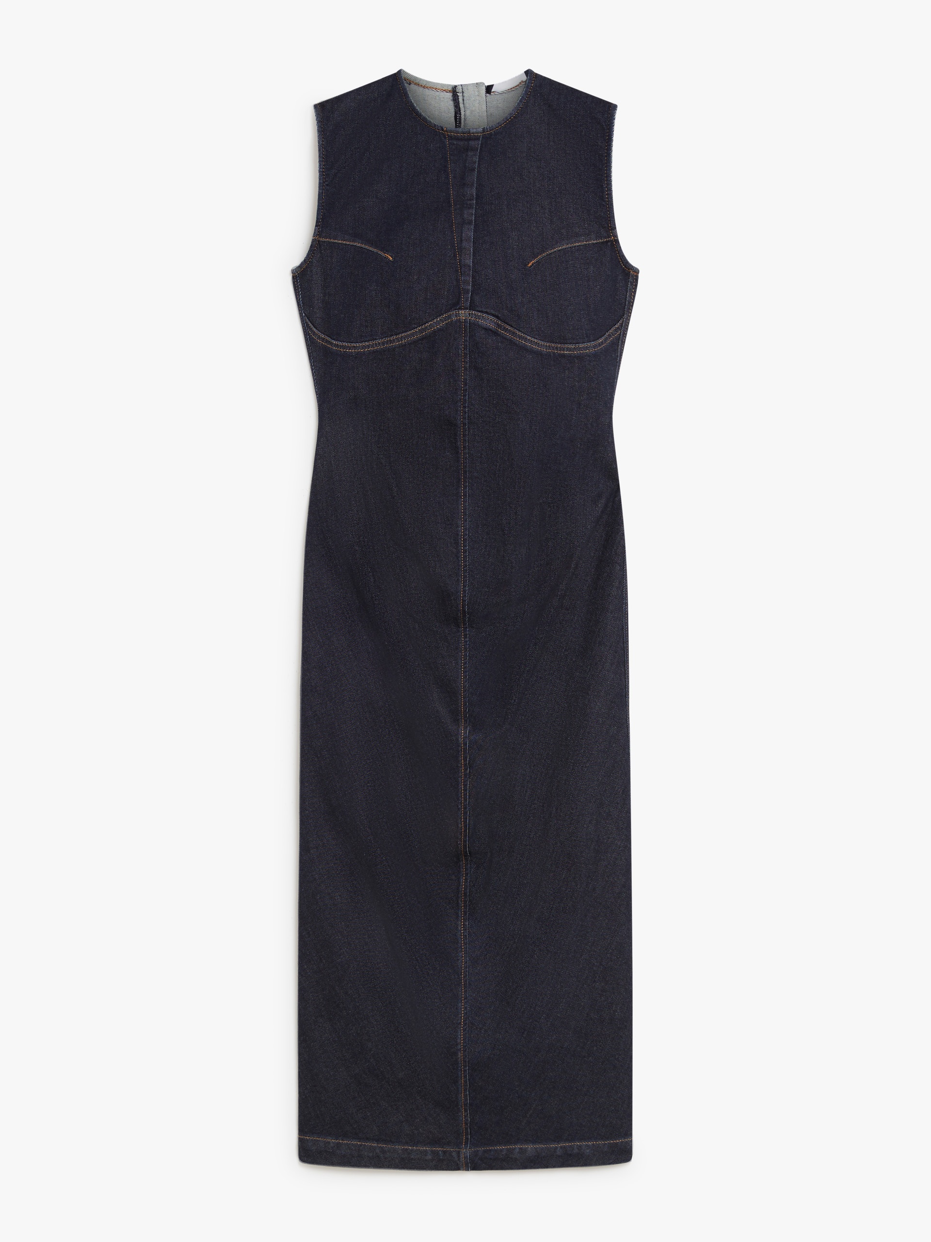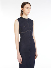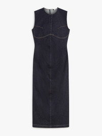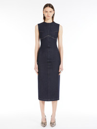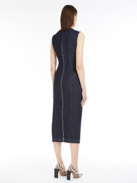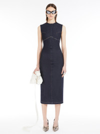 DETAILS Sleeveless dress with a spiral construction for a new interpretation of the iconic sheath dress. Crafted from super stretch denim with a clean dark treatment, it defines the silhouette thanks to the central seams and shaped sides. The exposed metal zip at the back and the contrasting tobacco-coloured stitching complete the design. Raised back darts for an original detail. COMPOSITION AND CARE 95% cotton, 4% polyester, 1% elastane. Machine wash cold delicate cycle; do not bleach; tumble dry low; line drying in the shade; cool iron; professionally dry clean perchloroethylene - mild process.; take care when wearing light-coloured clothes or accessories because, with the heat of the body, the indigo fabric , may fade and stain. be careful while sitting on light coloured surfaces, especially if wet. wash garments separately and always turned inside out. hang the garment turned inside out by avoiding to expose it to direct sunlight. avoid removing isolated stains. Distributed by Max Mara S.r.l., registered office in Reggio Emilia (Italy), Via Giulia Maramotti 4, 42124 (IT)