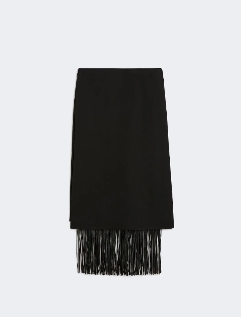 The clean line of this cady skirt is interrupted by the lightness of the detachable fringes, in coated jersey. The construction features an overlapping panel on the front. The different lengths create an asymmetrical movement, which sways with every step. - Flared skirt in washed double cotton cady and viscose - Gently flared fit with low waist. - Side closure with concealed zip. - Removable long fringes, in coated jersey - Regular fit Composition and Care Fabric 53% cotton, 47% viscose; decorations in 100% polyester; coating polyurethane. Do not wash; do not bleach; do not tumble dry; cool iron; professionally dry clean perchloroethylene - mild process; do not wet clean.; remove the decorations before washing. Distributed by Max Mara S.r.l., registered office in Reggio Emilia (Italy), Via Giulia Maramotti 4, 42124