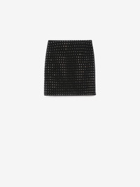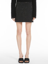 DETAILS Straight skirt made of scuba jersey covered with faceted rhinestones in a geometric texture. The fit is close and feminine, with fastening and small darts on the back. Stretch fabric lining. COMPOSITION AND CARE Outer fabric 81% polyamide, 19% elastane; inner fabric 100% polyester; lining 62% acetate, 38% polyester. Hand wash cold; do not bleach; do not tumble dry; flat drying in the shade; cool iron; do not dry clean; do not wet clean.; iron with a cloth between.; just steam it.; using neutral detergent.; don’t rub.; turn the articles inside out before washing.; to be ironed on reverse. Distributed by Max Mara S.r.l., registered office in Reggio Emilia (Italy), Via Giulia Maramotti 4, 42124 (IT)