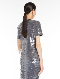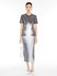 Crew-neck T-shirt made of printed, gradient technical jersey, with all-over embroidered transparent sequins. Feminine fit, with short sleeves. Lined. Regular fit. Composition and Care Jersey fabric 95% polyamide, 5% elastane; joining thread 100% polyester; lining 94% polyamide, 6% elastane; - exclusive of decoration. Hand wash cold (40°c max); do not bleach; do not tumble dry; flat drying in the shade; do not iron; do not dry clean; do not wet clean.; using neutral detergent.; don’t rub. Distributed by Max Mara S.r.l., registered office in Reggio Emilia (Italy), Via Giulia Maramotti 4, 42124