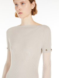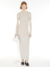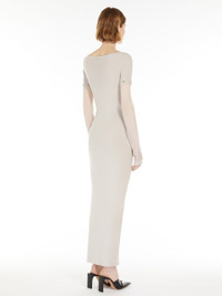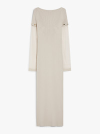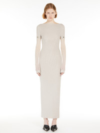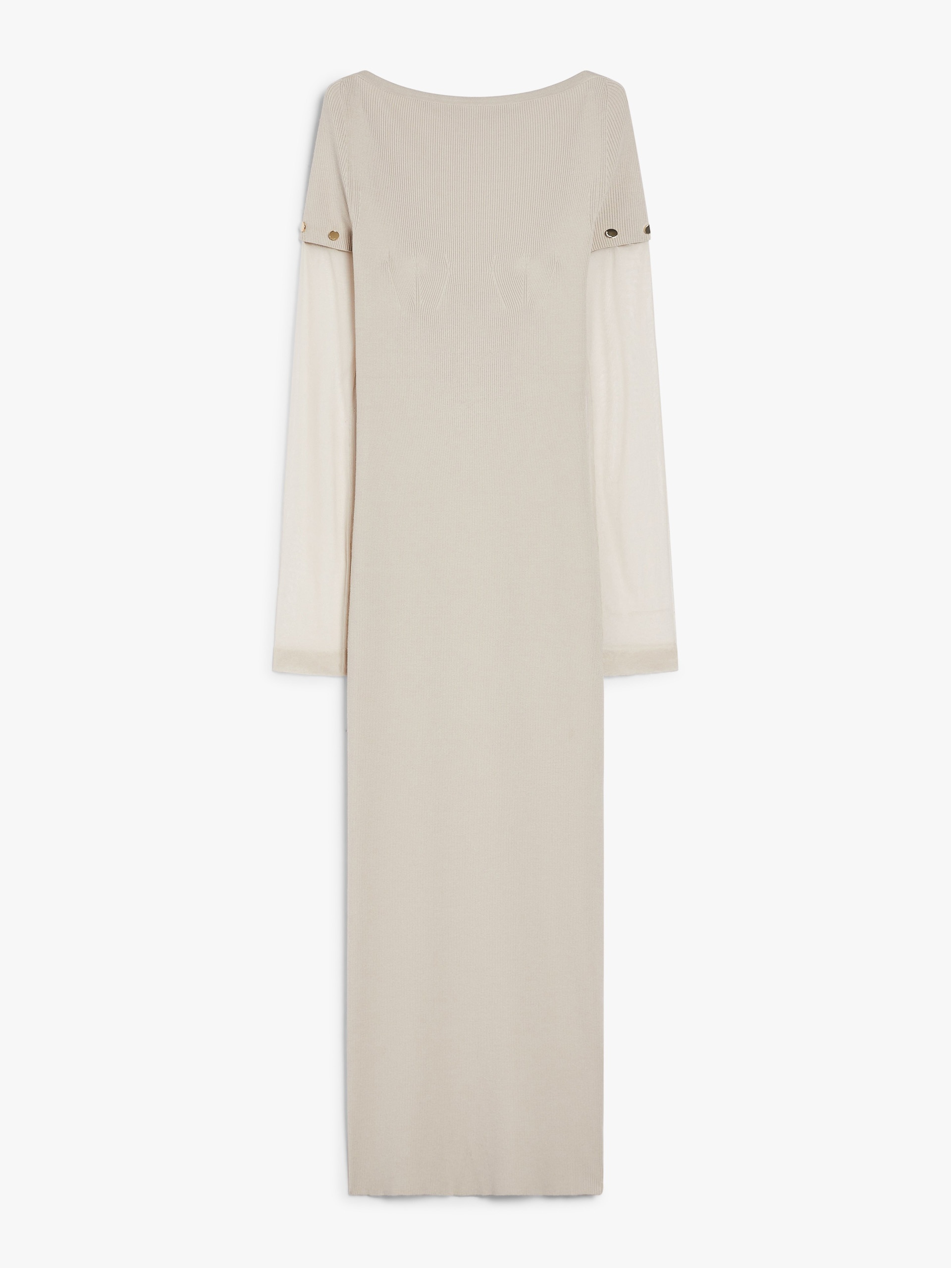 DETAILS Fitted, feminine long dress made of stretch viscose. The boat neck gives it a clean look. The transparent viscose sleeves can be removed through customised buttons. Drop-stitching on the front outlines the line of the bust. Regular fit. COMPOSITION AND CARE Knitted fabric 1 72% viscose, 28% polyester; knitted fabric 2 83% viscose, 17% polyamide. Hand wash cold; do not bleach; do not tumble dry; flat drying in the shade; cool iron; professionally dry clean perchloroethylene - mild process; do not wet clean.; iron with a cloth between.; using neutral detergent.; protect buttons before washing. Distributed by Max Mara S.r.l., registered office in Reggio Emilia (Italy), Via Giulia Maramotti 4, 42124 (IT)