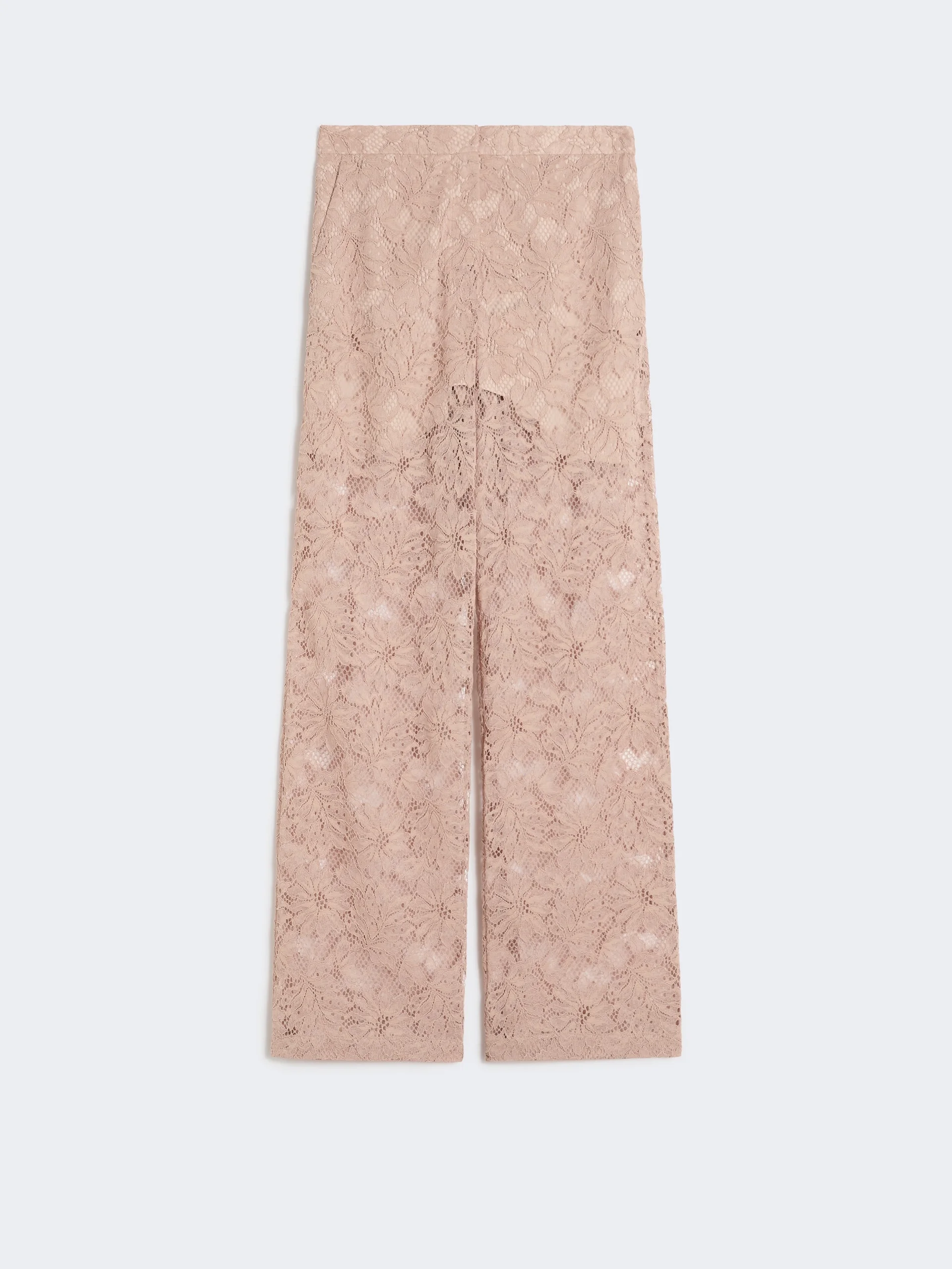 DETAILS Lace trousers with a rebrode floral pattern. The model boasts a straight leg, slim-cut waist, mannish-style pockets and a branded internal waistband. Style lined to below the hips. - Lace trousers with a rebrode floral pattern - Slim-cut top half with a straight-leg cut - Branded mannish waistband with a metal hook-and-bar fastening - Slant side pockets and welt rear pockets - Regular fit COMPOSITION AND CARE Jersey fabric 100% polyester; lining 100% cotton. Hand wash cold (40°c max); do not bleach; do not tumble dry; flat drying in the shade; cool iron; professionally dry clean perchloroethylene - mild process; do not wet clean.; iron with a cloth between.; using neutral detergent. Distributed by Max Mara S.r.l., registered office in Reggio Emilia (Italy), Via Giulia Maramotti 4, 42124 (IT) Collection: Sportmax Product code: 2781016206001 - SPXAFOSO