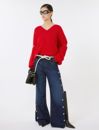 Jeans in soft and lightweight blue denim, with low waist and crotch. The garment features contrasting tobacco thread stitching and custom snap buttons along the sides. - Lightweight and soft black denim jeans with dark clean treatment - Wide leg fit with low waist and crotch - Closure with custom metal button and S-rivet on the right pocket - Matching tone stitching - Custom snap button motif along the sides - Back pockets with pen holder stitching - Wide fit Composition and Care 100% cotton. Machine wash cold delicate cycle; do not bleach; do not tumble dry; line drying in the shade; cool iron; do not dry clean.; wash the garment while it is fastened.; do not iron the buttons.; take care when wearing light-coloured clothes or accessories because, with the heat of the body, the indigo fabric , may fade and stain. be careful while sitting on light coloured surfaces, especially if wet. wash garments separately and always turned inside out. hang the garment turned inside out by avoiding to expose it to direct sunlight. avoid removing isolated stains.; contains non-textile parts of animal origin. Distributed by Max Mara S.r.l., registered office in Reggio Emilia (Italy), Via Giulia Maramotti 4, 42124
