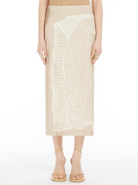 DETAILS Midi skirt made of lightweight viscose satin, with contrasting mesh print. The construction features a single panel joined on the right side, creating continuity of the print and a side slit. Side opening with zip. COMPOSITION AND CARE 97% viscose, 3% elastane. Do not wash; do not bleach; do not tumble dry; cool iron; professionally dry clean perchloroethylene - mild process; do not wet clean.; don’t iron the labels. Distributed by Max Mara S.r.l., registered office in Reggio Emilia (Italy), Via Giulia Maramotti 4, 42124 (IT)