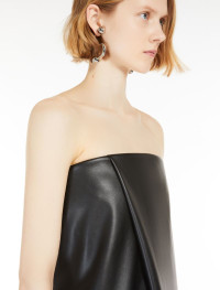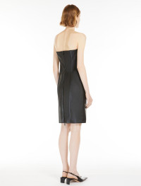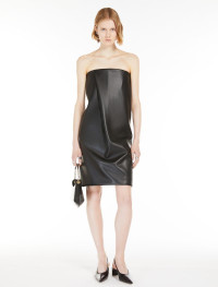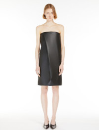 Coated fabric dress with a close-fitting sheath silhouette. The straight neckline and special construction define the diagonal pleat on the front, while the back features seams and shaping. Back opening with double-slider metal zip. Lined garment with adjustable, removable shoulder straps. Regular fit. Composition and Care Jersey fabric 100% polyester; lining 78% polyamide, 22% elastane; layer polyurethanic resin. Hand wash cold (40°c max); do not bleach; do not tumble dry; flat drying in the shade; cool iron; do not dry clean; do not wet clean.; iron with a cloth between.; using neutral detergent.; don’t rub.; turn the articles inside out before washing.; to be ironed on reverse. Distributed by Max Mara S.r.l., registered office in Reggio Emilia (Italy), Via Giulia Maramotti 4, 42124
