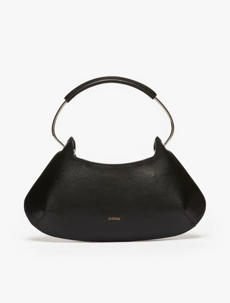 Medium-sized Caju bag with semi-gloss leather panels and golden front logo. The handle is completed by the iconic ball detail, recalling the shape of piercings. Lined interior completed by a flat pocket. - Vegetable-tanned calf leather bag - Crescent shape - Metallic, piercing-effect spheres with a shiny palladium finish - Zip fastening and inside pocket - Measurements: 45 x 13 x 21 cm Composition and Care Handbag in cattle; with details in metal; lining in 60 nylon, 40 polyurethane. Distributed by Max Mara S.r.l., registered office in Reggio Emilia (Italy), Via Giulia Maramotti 4, 42124