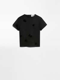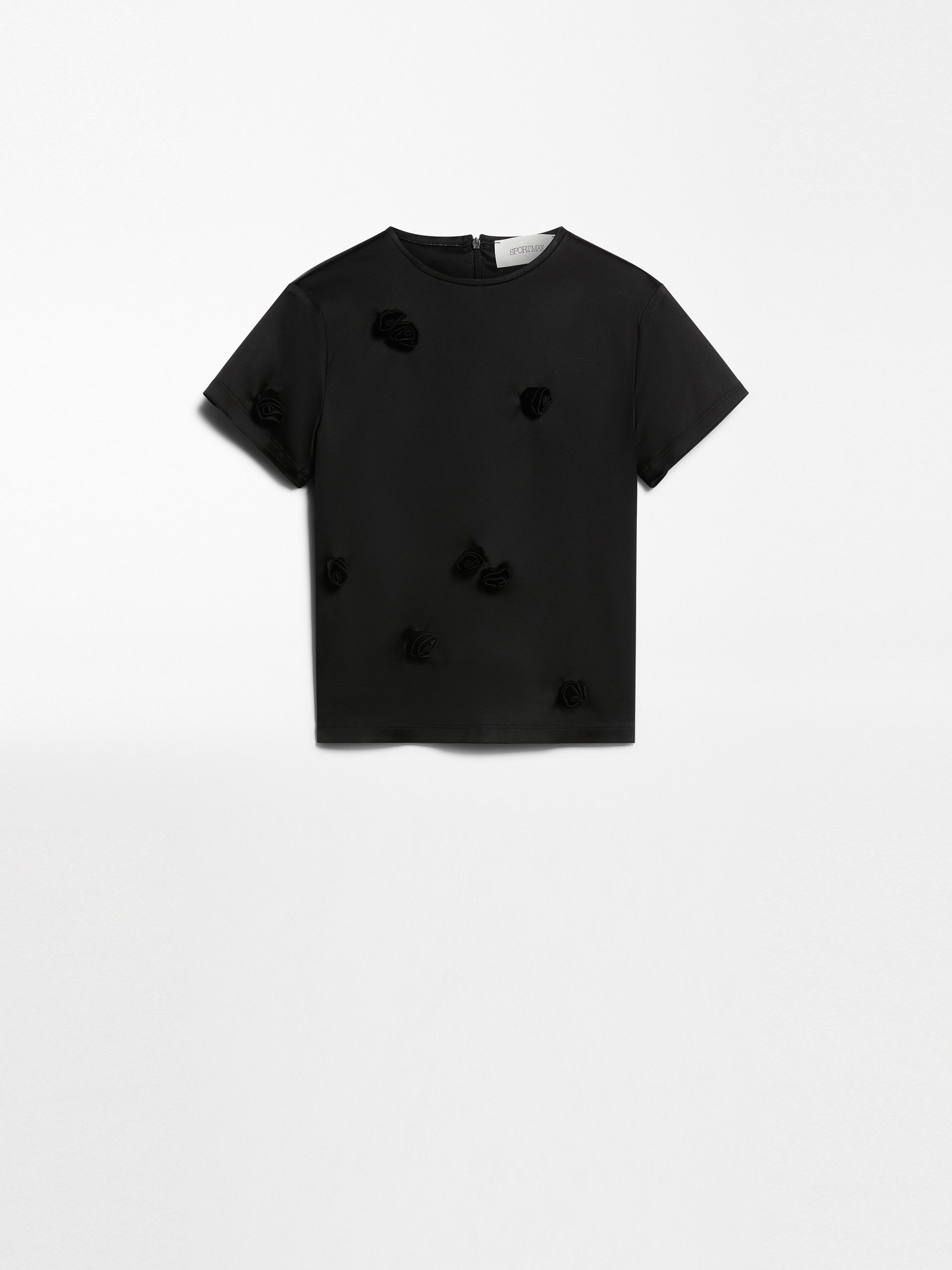 DETAILS Stretch satin crew-neck top featuring a form-fitting, feminine cut. Concealed back zip and hand-embroidered small rose detail found all over the garment. Stretch lining. COMPOSITION AND CARE Fabric 74% acetate, 23% polyamide, 3% elastane; lining 62% acetate, 38% polyester. Hand wash cold; do not bleach; do not tumble dry; flat drying in the shade; cool iron; do not dry clean; do not wet clean.; iron with a cloth between.; using neutral detergent.; don’t rub.; turn the articles inside out before washing.; to be ironed on reverse.; do not iron the decoration. Distributed by Max Mara S.r.l., registered office in Reggio Emilia (Italy), Via Giulia Maramotti 4, 42124 (IT)
