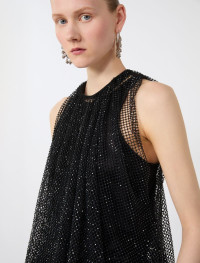 Dedicated to glamorous occasions, this mesh top features a sleeveless line and matching crystals applied all over. The elastic insert at the garment’s hem creates a bubble effect. - Mesh top with crystals and matching jersey tank top - Soft cut for the mesh layer, streamlined for the tank top - Rounded neckline - Sleeveless style - Bubble hem - Regular fit Composition and Care Jersey top jersey fabric 95% polyester, 5% elastane; - exclusive of decoration. Singlet 100% viscose. Jersey top: hand wash cold (40°c max); do not bleach; do not tumble dry; flat drying in the shade; do not iron; do not dry clean; do not wet clean.; Using neutral detergent.; Don’t rub. Singlet: machine wash cold delicate cycle; do not bleach; do not tumble dry; flat drying in the shade; cool iron; professionally dry clean perchloroethylene - mild process; professional wet cleaning - very mild process.; Iron with a cloth between.; Using neutral detergent.; Turn the articles inside out before washing.; To be ironed on reverse. Distributed by Max Mara S.r.l., registered office in Reggio Emilia (Italy), Via Giulia Maramotti 4, 42124