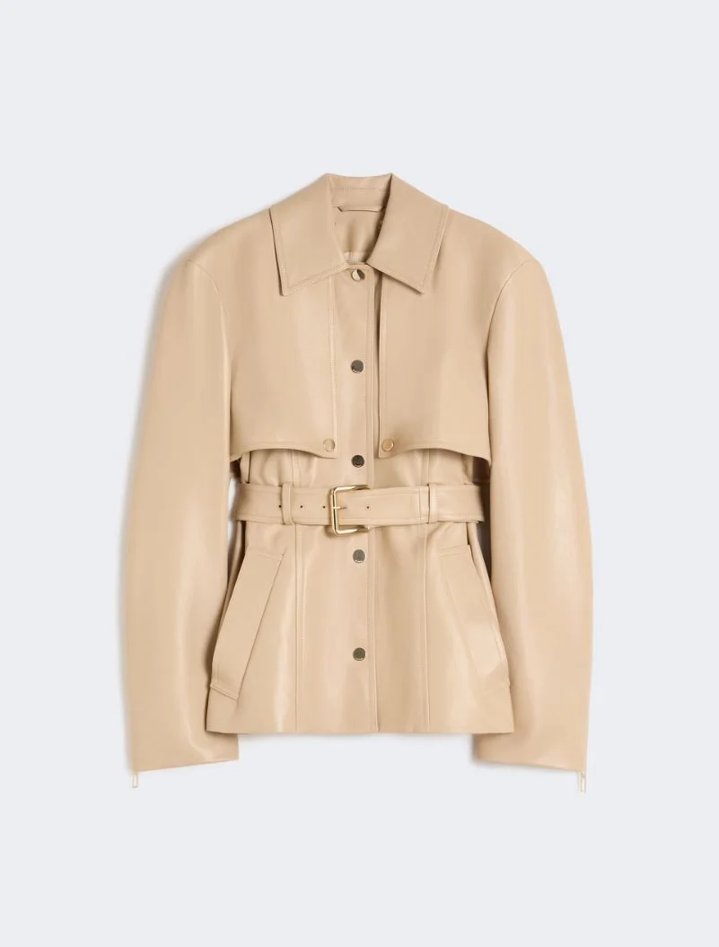 Nappa leather 2-in-1 jacket: the top layer comprises a cropped jacket with a rounded neckline and long sleeves. The bottom layer, on the other hand, features a press-stud fastening and waist-cinching long belt to accentuate the silhouette. The two garments can be attached to one another via the metal press studs. - Lined Nappa leather jacket - Round-neck cropped top layer - Sleeveless shirt-neck bottom layer - Waist belt - Regular fit Composition and Care Style in lamb leather; lining in 100% polyester. Do not wash; do not bleach; do not tumble dry; do not iron; do not dry clean; do not wet clean.; do not wash or dry clean by fabric methods. clean only by leather and fur specialists.; remove the belt before washing.; care should be taken with light-coloured garments and accessories because body heat could lead the leather to colour loss and staining. care should be taken when sitting on light-coloured surfaces, especially if damp. avoid lengthy exposure to direct light or heat sources. do not store garments in plastic bags for long periods. Distributed by Max Mara S.r.l., registered office in Reggio Emilia (Italy), Via Giulia Maramotti 4, 42124