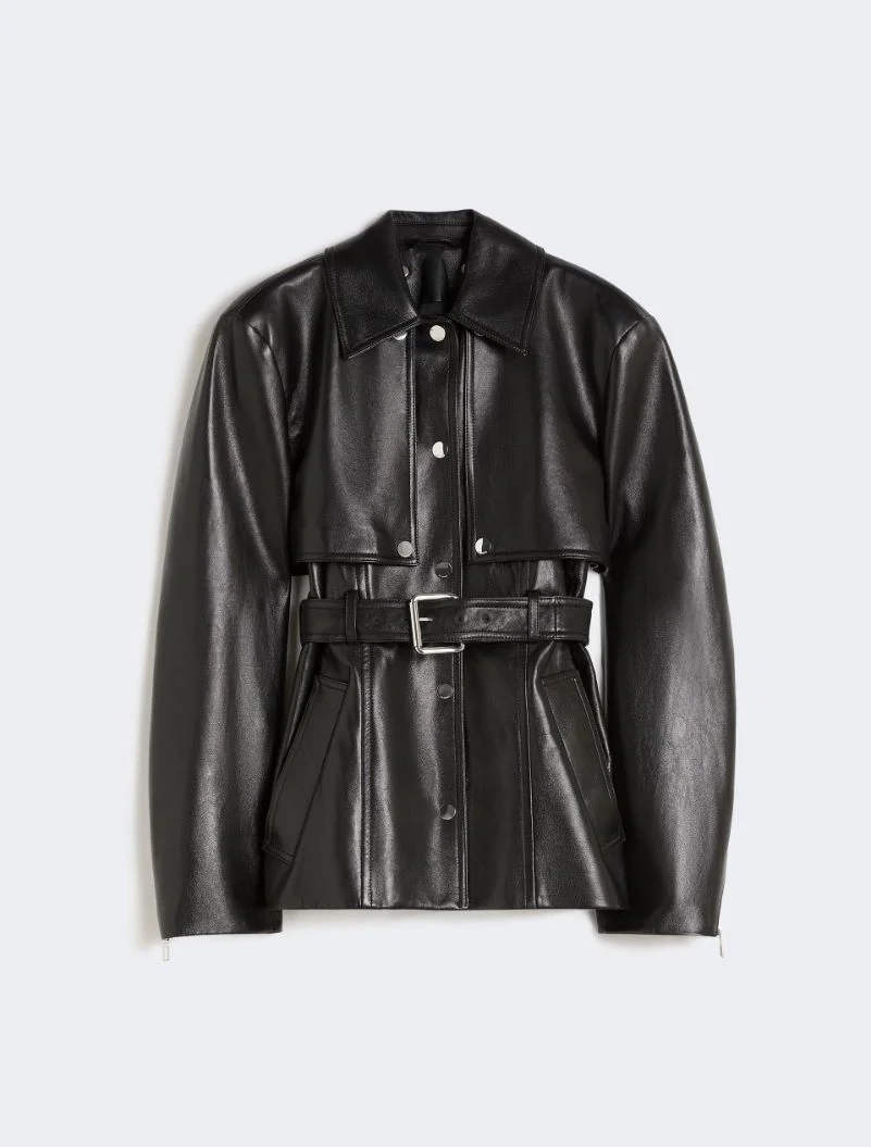 Nappa leather 2-in-1 jacket: the top layer comprises a cropped jacket with a rounded neckline and long sleeves. The bottom layer, on the other hand, features a press-stud fastening and waist-cinching long belt to accentuate the silhouette. The two garments can be attached to one another via the metal press studs. - Lined Nappa leather jacket - Round-neck cropped top layer - Sleeveless shirt-neck bottom layer - Waist belt - Regular fit Composition and Care Style in lamb leather; lining in 100% polyester. Do not wash; do not bleach; do not tumble dry; do not iron; do not dry clean; do not wet clean.; do not wash or dry clean by fabric methods. clean only by leather and fur specialists.; remove the belt before washing.; care should be taken with light-coloured garments and accessories because body heat could lead the leather to colour loss and staining. care should be taken when sitting on light-coloured surfaces, especially if damp. avoid lengthy exposure to direct light or heat sources. do not store garments in plastic bags for long periods. Distributed by Max Mara S.r.l., registered office in Reggio Emilia (Italy), Via Giulia Maramotti 4, 42124
