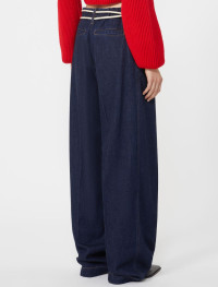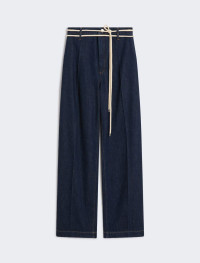 Hybrid design trousers, mixing men's tailored construction with jogger details. Crafted from lightweight denim with a low rise and crotch. - Lightweight and soft blue denim trousers with clean dark treatment - Straight fit with low waist and crotch - Double-wrap drawstring closure at the waist, custom snap button and elastic insert on the back - Tobacco-coloured contrast stitching - Trouser crease front and back - Slant side pockets and back welt pockets - Double-loop pattern for inserting the belt at waist level or slightly below - Regular fit Composition and Care 100% cotton. Machine wash cold delicate cycle; do not bleach; do not tumble dry; line drying in the shade; cool iron; professionally dry clean perchloroethylene - mild process.; wash the garment while it is fastened.; do not iron the buttons.; remove the belt before washing.; take care when wearing light-coloured clothes or accessories because, with the heat of the body, the indigo fabric , may fade and stain. be careful while sitting on light coloured surfaces, especially if wet. wash garments separately and always turned inside out. hang the garment turned inside out by avoiding to expose it to direct sunlight. avoid removing isolated stains. Distributed by Max Mara S.r.l., registered office in Reggio Emilia (Italy), Via Giulia Maramotti 4, 42124
