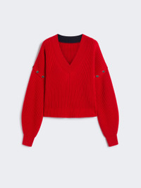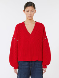 DETAILS A jumper with a transformative spirit, designed in an oversized silhouette and detailed with custom metal buttons that allow the sleeve cuffs to be detached. Pure wool rib-knit jumper Oversize fit V neck Custom metal buttons on the sleeve that allow you to detach the cuff Wide fit COMPOSITION AND CARE 100% virgin wool. Hand wash cold (40°c max); do not bleach; do not tumble dry; flat drying in the shade; cool iron; professionally dry clean perchloroethylene - mild process; do not wet clean.; iron with a cloth between.; using neutral detergent.; protect buttons before washing. Distributed by Max Mara S.r.l., registered office in Reggio Emilia (Italy), Via Giulia Maramotti 4, 42124 (IT)