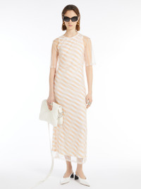 DETAILS Double-layer dress, with a figure-hugging, sleeveless inner part made of stretch technical jersey. The tulle outer part has a T-shirt construction, with a crew neck and short sleeves. Both materials are printed with a two-tone stripes at different angles for an op-art effect. Regular fit. COMPOSITION AND CARE Jersey dress 88% polyamide, 12% elastane. Petticoat 75% polyamide, 25% elastane. Jersey dress: hand wash cold; do not bleach; do not tumble dry; flat drying in the shade; cool iron; professionally dry clean perchloroethylene - mild process; do not wet clean.; Iron with a cloth between.; Using neutral detergent.; Don’t rub.; Turn the articles inside out before washing.; To be ironed on reverse. Petticoat: hand wash cold; do not bleach; do not tumble dry; flat drying in the shade; cool iron; professionally dry clean perchloroethylene - mild process; do not wet clean.; Iron with a cloth between.; Using neutral detergent.; Don’t rub.; Turn the articles inside out before washing.; To be ironed on reverse. Distributed by Max Mara S.r.l., registered office in Reggio Emilia (Italy), Via Giulia Maramotti 4, 42124 (IT)