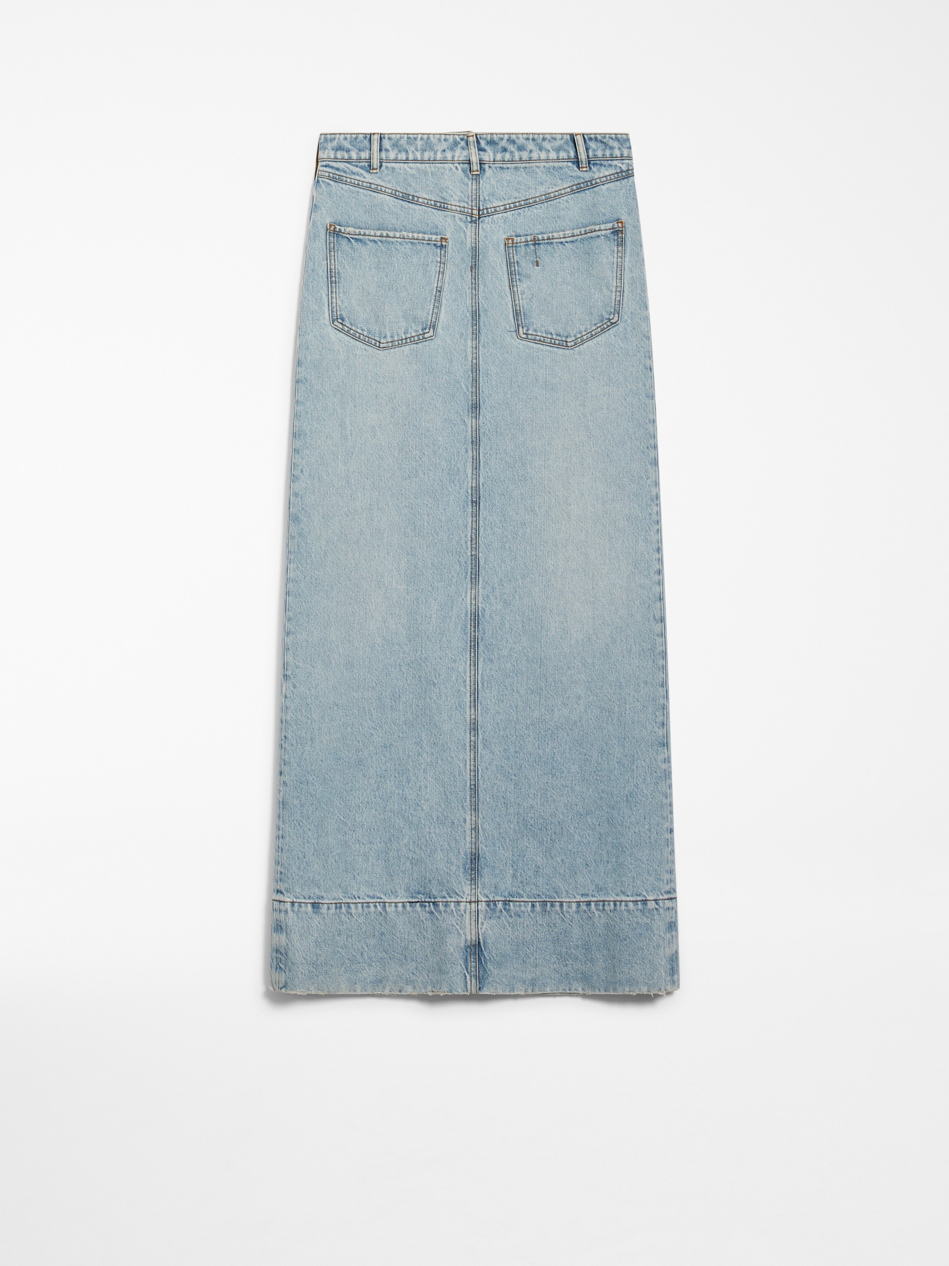 DETAILS Long skirt in authentic indigo denim with a worn effect. The construction features a shaped yoke and patch pockets on the front, inspired by the back of five-pocket trousers. The back features a covered zip and an open central vent with a shaped line. Regular fit with slightly low waist. Garment with contrast stitching and customised leather back label. COMPOSITION AND CARE 100% cotton. Machine wash cold delicate cycle; do not bleach; do not tumble dry; line drying in the shade; cool iron; do not dry clean.; don’t iron the labels.; take care when wearing light-coloured clothes or accessories because, with the heat of the body, the indigo fabric , may fade and stain. be careful while sitting on light coloured surfaces, especially if wet. wash garments separately and always turned inside out. hang the garment turned inside out by avoiding to expose it to direct sunlight. avoid removing isolated stains.; contains non-textile parts of animal origin. Distributed by Max Mara S.r.l., registered office in Reggio Emilia (Italy), Via Giulia Maramotti 4, 42124 (IT)
