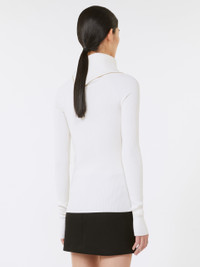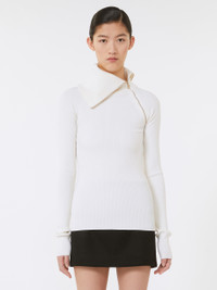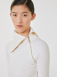 DETAILS Wool-blend jumper in a stretch yarn that accentuates the silhouette. The special collar construction with diagonal zip, and second zip on the left, adds a sporty note to the design. Jumper made of a stretch wool-blend yarn Fitted High neck with contrasting interior Diagonal zip opening on neck and left shoulder Side zip opening on the left side Raglan sleeves Fitted COMPOSITION AND CARE 100% virgin wool. Hand wash cold (40°c max); do not bleach; do not tumble dry; flat drying in the shade; cool iron; professionally dry clean perchloroethylene - mild process; do not wet clean.; iron with a cloth between.; using neutral detergent.; protect accessories before washing. Distributed by Max Mara S.r.l., registered office in Reggio Emilia (Italy), Via Giulia Maramotti 4, 42124 (IT)