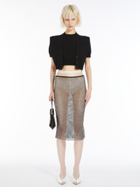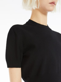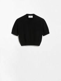 DETAILS T-shirt style top made of stretch viscose. Cropped at the waist, with a feminine fit, short sleeves and seamless knit details along the shoulders. Neckline, armhole and hems are finished in ribbed knit. COMPOSITION AND CARE 70% viscose, 30% polyester. Hand wash cold; do not bleach; do not tumble dry; flat drying in the shade; cool iron; professionally dry clean perchloroethylene - mild process; do not wet clean.; iron with a cloth between.; using neutral detergent.; don’t iron the labels. Distributed by Max Mara S.r.l., registered office in Reggio Emilia (Italy), Via Giulia Maramotti 4, 42124 (IT)