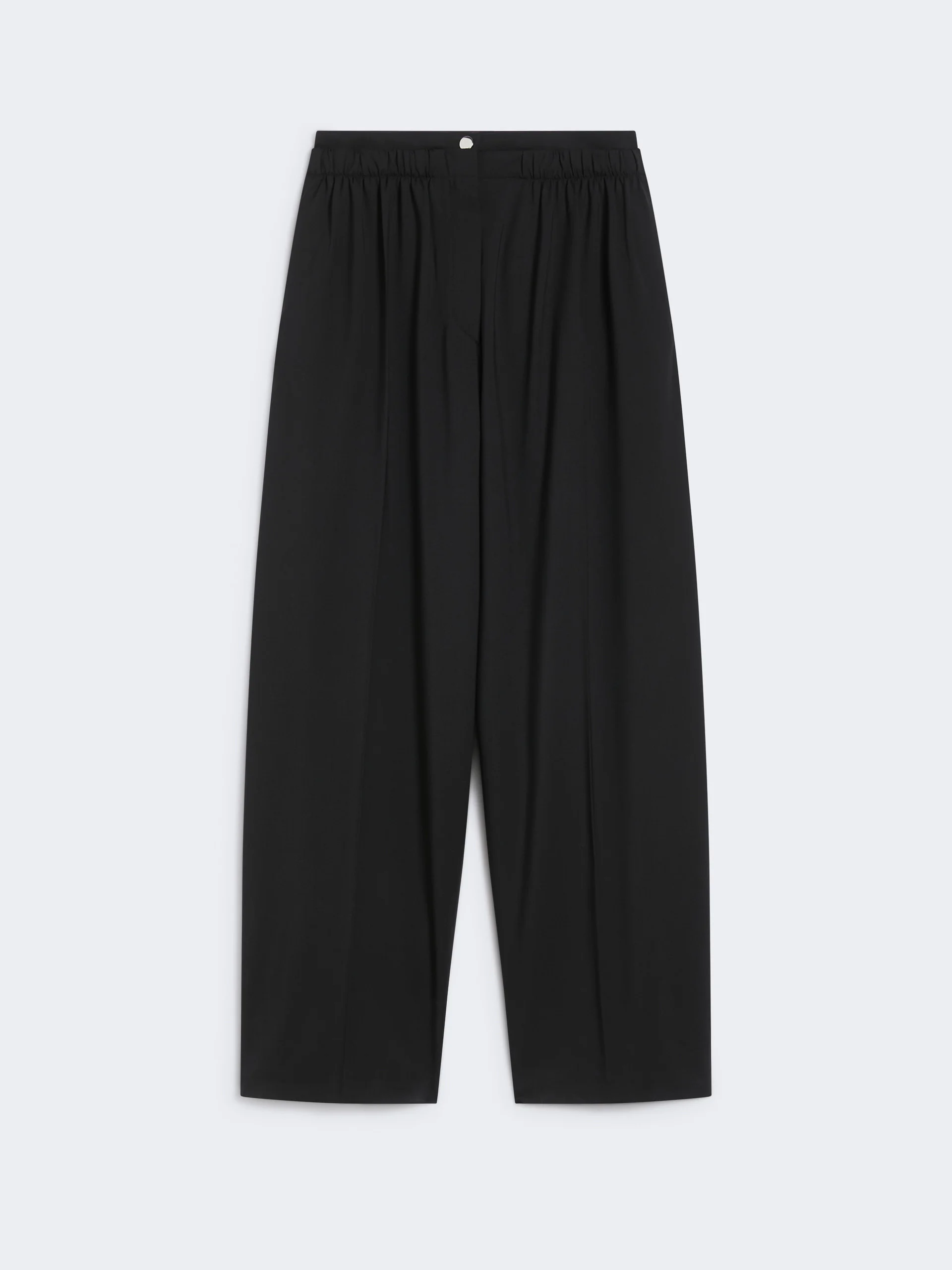 DETAILS The double-gathered belt adds volume and a dynamic touch to these stretch gabardine trousers. Wide volume on the leg, with trouser crease front and back. Stretch, technical gabardine wool trousers Wide fit with slightly low waist Customised concealed zip and snap-button fastening Double belt motif Gathering at the waist In-seam side pockets and rear welt pockets Regular fit COMPOSITION AND CARE 95% virgin wool, 5% elastane. Do not wash; do not bleach; do not tumble dry; cool iron; professionally dry clean perchloroethylene - mild process; do not wet clean.; wash the garment while it is fastened. Distributed by Max Mara S.r.l., registered office in Reggio Emilia (Italy), Via Giulia Maramotti 4, 42124 (IT)