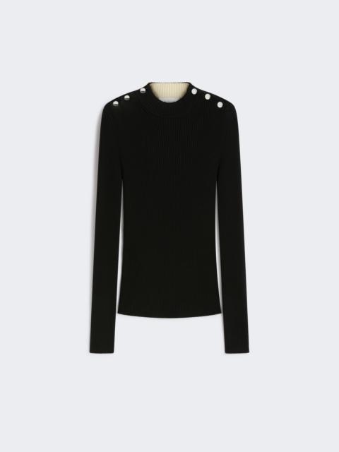 DETAILS Pure wool ribbed knit jumper with distinctively refined appearance and metal buttons on the shoulder and sleeve ends. Pure wool rib-knit jumper Fitted Rounded neckline Custom metal button motif on shoulders and along the sleeves Regular fit COMPOSITION AND CARE 100% virgin wool. Hand wash cold (40°c max); do not bleach; do not tumble dry; flat drying in the shade; cool iron; professionally dry clean perchloroethylene - mild process; do not wet clean.; iron with a cloth between.; using neutral detergent.; protect buttons before washing. Distributed by Max Mara S.r.l., registered office in Reggio Emilia (Italy), Via Giulia Maramotti 4, 42124 (IT)