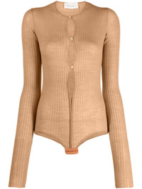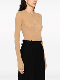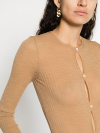 sand beige wool blend ribbed knit cut-out detailing round neck front button fastening hook and eye fastening long sleeves Just a reminder that this piece must be tried on over your own garments. Size & Fit Model Measurements: Height: 1.79 m Bust/Chest: 84.0 cm Hips: 91.0 cm Waist: 61.0 cm Model wears size XS Fabric and Care Designer Style ID: 2323661036650 Designer Colour: 002 BEIGE Composition: Wool 62%, Acrylic 26%, Polyamide 12% Washing instructions: Hand Wash