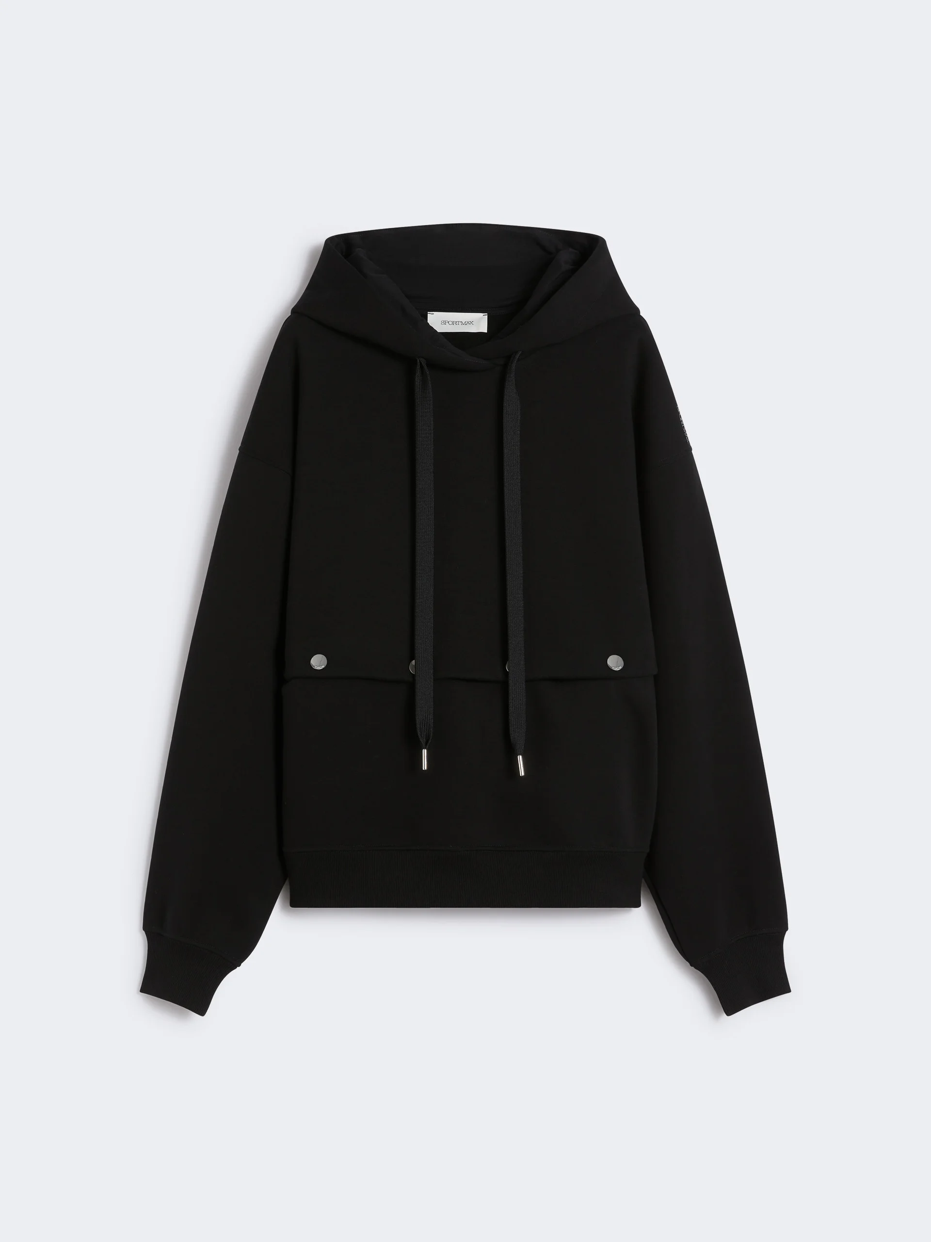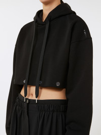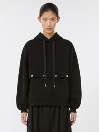 DETAILS Hoodie featuring a detachable design with branded press stud detail on the bodice. Detach the hem for a cropped waist cut. Stretch cotton-blend sweatshirt Oversized fit Drawstring hood Branded metal press studs on the bodice Logo print on the left shoulder Rib-knit hem and cuffs COMPOSITION AND CARE Jersey fabric 87% cotton, 13% elastomultiester; lining 100% cotton. Machine wash cold delicate cycle; do not bleach; do not tumble dry; flat drying in the shade; cool iron; do not dry clean; professional wet cleaning - very mild process.; iron with a cloth between.; using neutral detergent.; protect accessories before washing.; turn the articles inside out before washing.; to be ironed on reverse. Distributed by Max Mara S.r.l., registered office in Reggio Emilia (Italy), Via Giulia Maramotti 4, 42124 (IT)