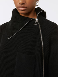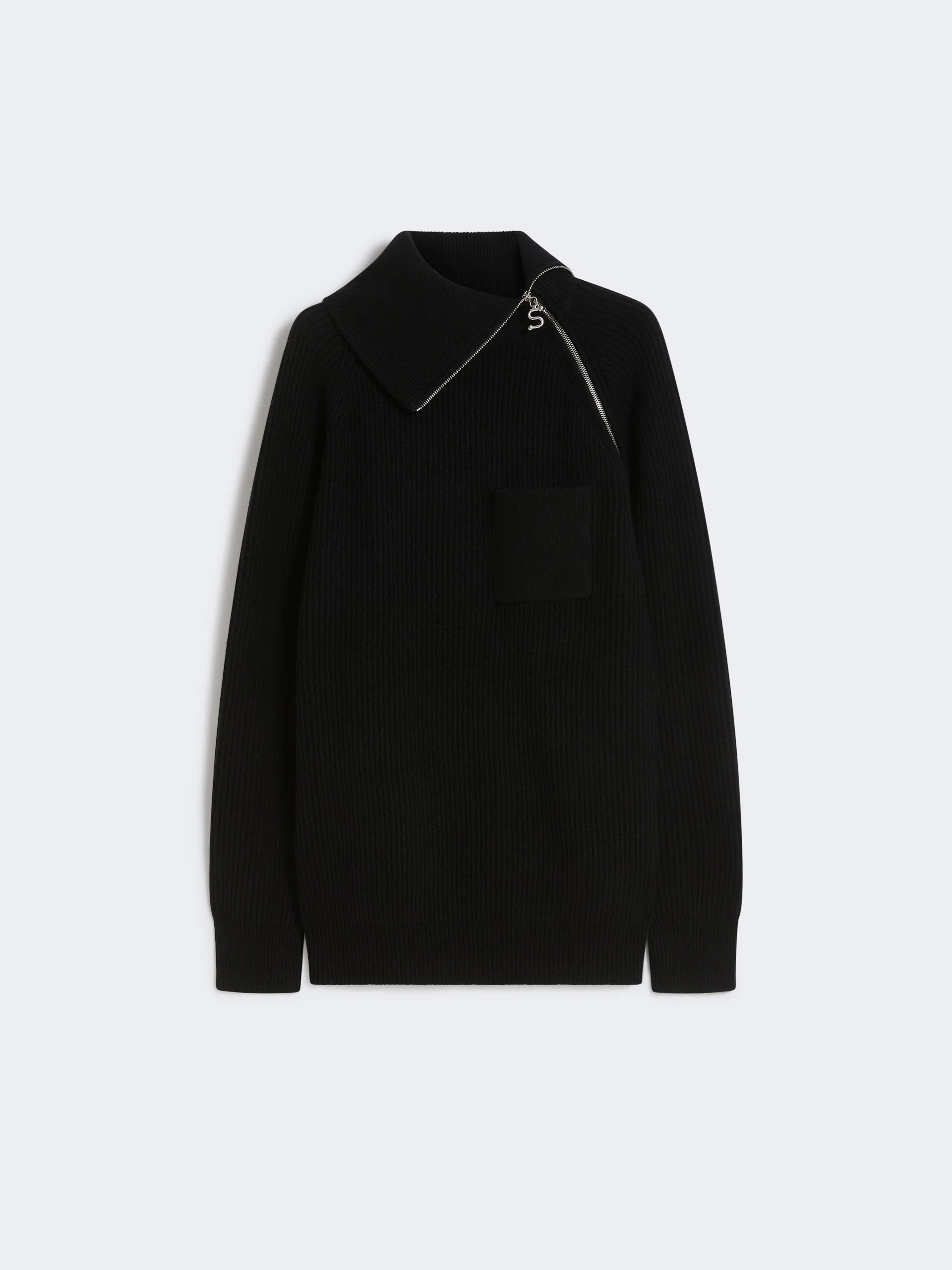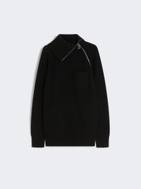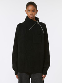 DETAILS Loose and enveloping, the cashmere blend jumper features a soft volume and a special construction with a raised collar and diagonal zip. Wool and cashmere yarn jumper Loose fit High neck with contrasting interior Diagonal zip opening on neck and left shoulder Patch pocket on the chest Raglan sleeves Wide fit COMPOSITION AND CARE 80% wool, 20% cashmere. Hand wash cold (40°c max); do not bleach; do not tumble dry; flat drying in the shade; cool iron; professionally dry clean perchloroethylene - mild process; do not wet clean.; iron with a cloth between.; using neutral detergent.; protect accessories before washing. Distributed by Max Mara S.r.l., registered office in Reggio Emilia (Italy), Via Giulia Maramotti 4, 42124 (IT)
